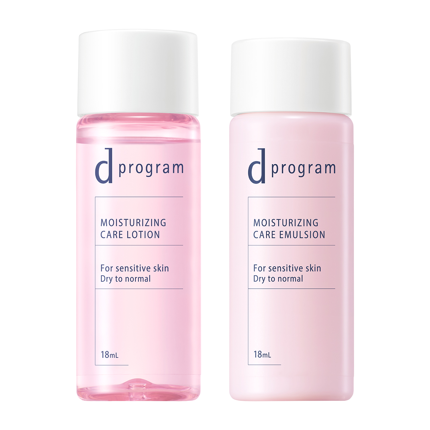 乾燥ケア&肌荒れ予防 化粧水・乳液セット誰の肌にも存在し、美しい肌の鍵である美肌菌に着目。 繰り返しがちな乾燥をケアし、肌荒れを予防。深いうるおいに満ちた「なめらか美肌」へ導く化粧水・乳液のセットです。 普通肌~乾燥肌向けです。 [セット内容] ・d プログラム モイストケア ローション EX (医薬部外品) 敏感肌用化粧水 18mL ・d プログラム モイストケア エマルジョン EX (医薬部外品) 敏感肌用乳液 18mL