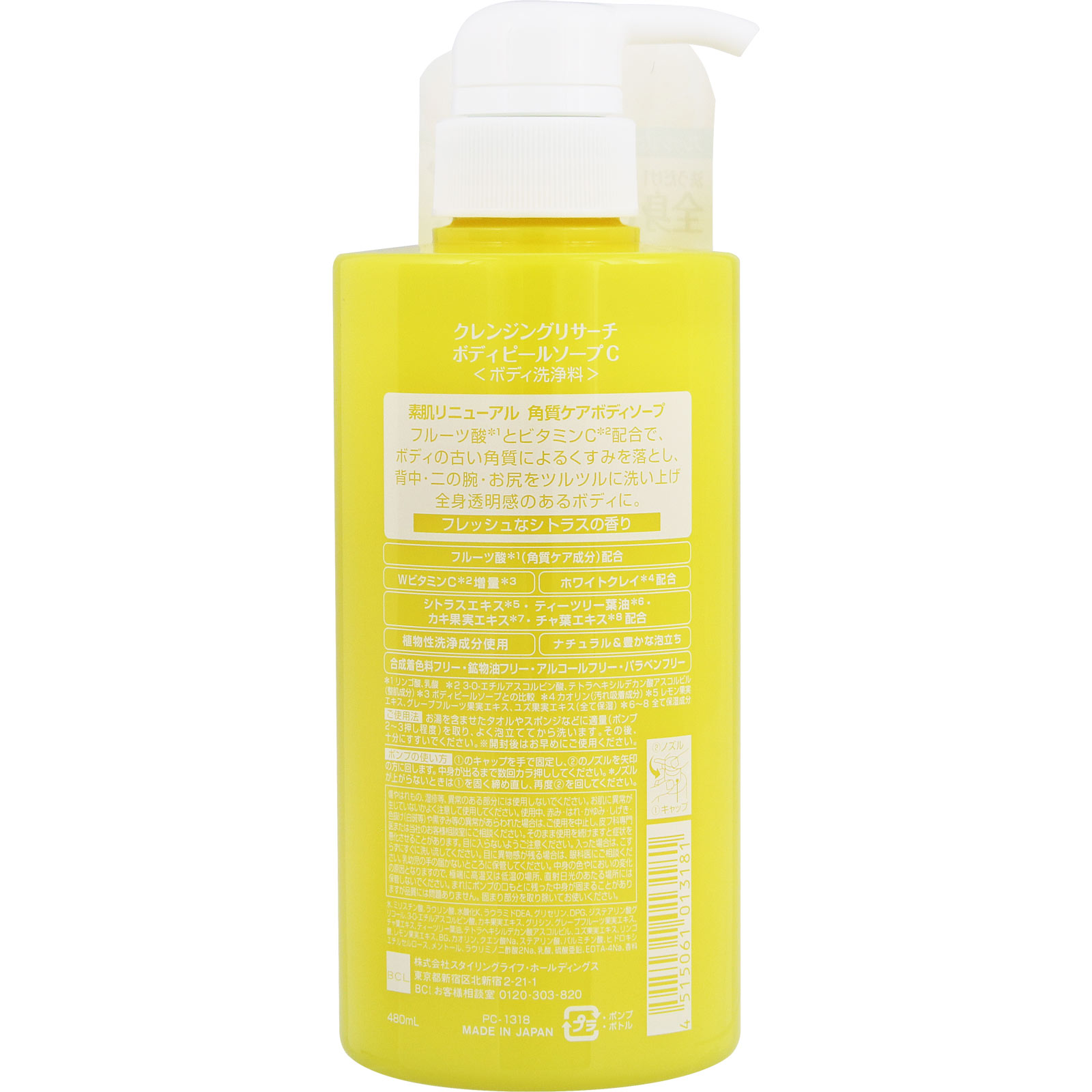 洗うだけ!全身ピーリング※透明感背中 二の腕 おしりザラつき・ブツブツ・黒ずみに!※古い角質を除去すること素肌リニューアル 角質ケアボディソープフルーツ酸*1とビタミンC*2配合で、ボディの古い角質によるくすみを落とし、背中・二の腕・お尻をツルツルに洗い上げ全身透明感のあるボディに。フレッシュなシトラスの香りフルーツ酸*1(角質ケア成分)配合WビタミンC*2増量*3ホワイトクレイ*4配合シトラスエキス*5・ティーツリー葉油*6・カキ果実エキス*7・チャ葉エキス*8配合植物性洗浄成分使用ナチュラル&豊かな泡立ち合成着色料フリー・鉱物油フリー・アルコールフリー・パラベンフリー*1 リンゴ酸、乳酸*2 3-O-エチルアスコルビン酸、テトラヘキシルデカン酸アスコルビル(整肌成分)*3 ボディピールソープとの比較*4 カオリン(汚れ吸着成分)*5 レモン果実エキス、グレープフルーツ果実エキス、ユズ果実エキス(全て保湿)*6~8 全て保湿成分