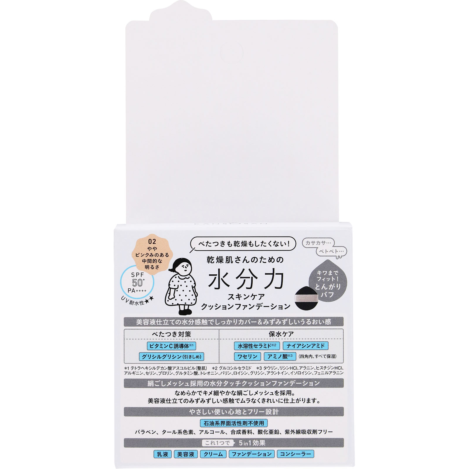水分感触&ハイカバークッションファンデうるんと透明感ベタつかず1日中みずみずしいややピンクみのある中間的な明るさSPF50+ PA++++UV耐水性★★べたつきも乾燥もしたくない!カサカサ・・・ベトベト・・・乾燥肌さんのための水分力スキンケアクッションファンデーションキワまでフィット!とんがりパフ美容液仕立ての水分感触でしっかりカバー&みずみずしいうるおい感○べたつき対策ビタミンC誘導体※1グリシルグリシン(引きしめ)○保水ケア水溶性セラミド※2ナイアシンアミドワセリンアミノ酸※3(四角内、すべて保湿)*1 テトラヘキシルデカン酸アスコルビル(整肌)*2 グルコシルセラミド*3 タウリン、リシンHCl、アラニン、ヒスチジンHCl、アルギニン、セリン、プロリン、グルタミン酸、トレオニン、バリン、ロイシン、グリシン、アラントイン、イソロイシン、フェニルアラニン○絹ごしメッシュ採用の水分タッチクッションファンデーションなめらかでキメ細やかな絹ごしメッシュを採用。美容液仕立てのみずみずしい感触でムラなくきれいに仕上がります。○やさしい使い心地とフリー設計石油系界面活性剤不使用パラベン、タール系色素、アルコール、合成香料、酸化亜鉛、紫外線吸収剤フリー○これ1つで 5in1効果乳液 美容液 クリーム ファンデーション コンシーラー