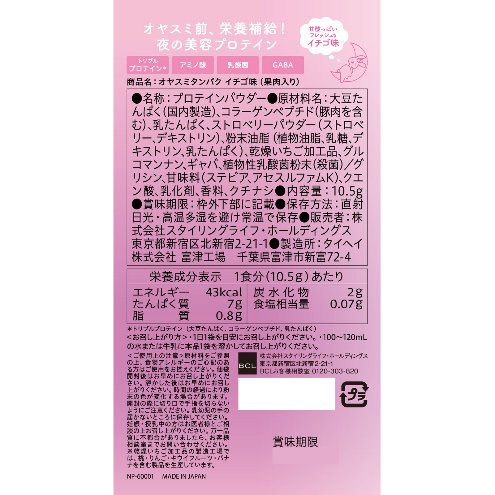 大豆たんぱく(国内製造)、コラーゲンペプチド(豚肉を含む)、乳たんぱく、ストロベリーパウダー(ストロベリー、デキストリン)、粉末油脂(植物油脂、乳糖、デキストリン、乳たんぱく)、乾燥いちご加工品、グルコマンナン、ギャバ、植物性乳酸菌粉末(殺菌)/グリシン、甘味料(ステビア、アセスルファムK)、クエン酸、乳化剤、香料、クチナシ