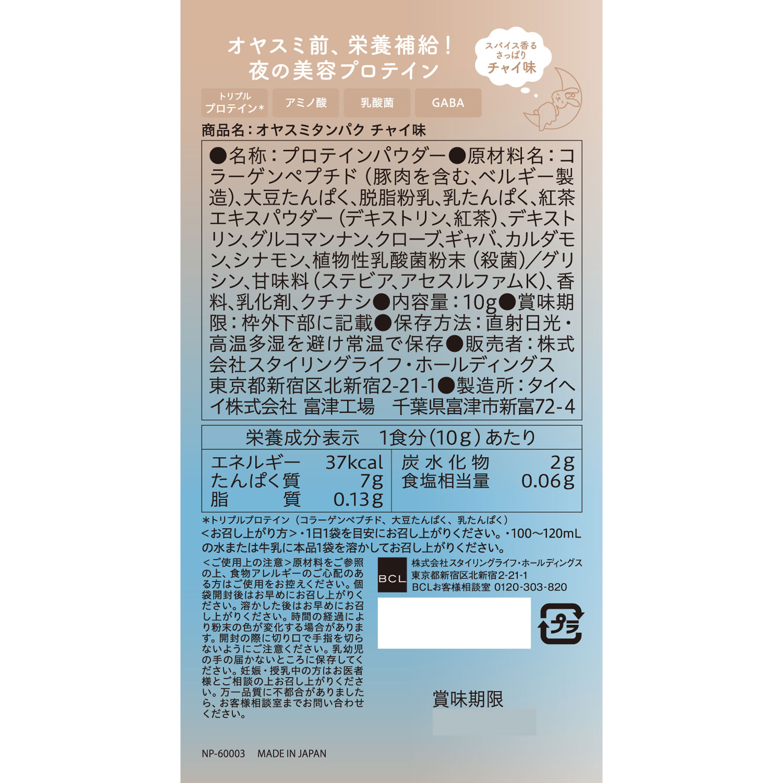 オヤスミ前、栄養補給!夜の美容プロテイントリプルプロテイン* アミノ酸 乳酸菌 GABAスパイス香るさっぱりチャイ味*トリプルプロテイン(大豆たんぱく、コラーゲンペプチド、乳たんぱく)