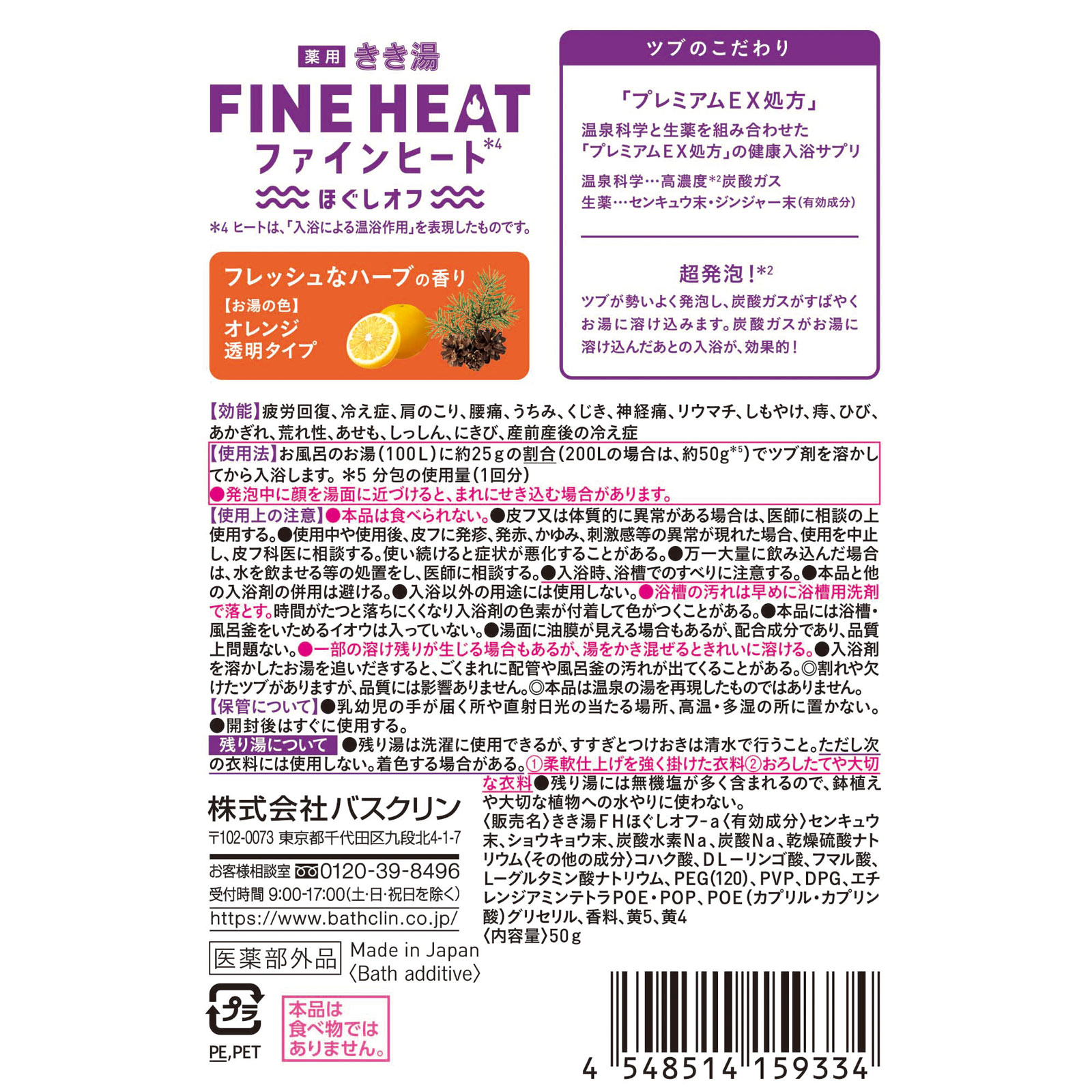 だるい足腰などの疲れをスーッと軽く*1超発泡*2!温泉科学と生薬のチカラ*1 温浴効果を高めて疲労回復*2 きき湯食塩炭酸湯比HOTな健康を、明日へ。高濃度*2炭酸+W生薬*3*3 センキュウ末・ジンジャー末(有効成分)ためこみがちな疲れ・冷え性に1回分薬用入浴剤ファインヒート*4*4 ヒートは、「入浴による温浴作用」を表現したものです。フレッシュなハーブの香り【お湯の色】オレンジ 透明タイプツブのこだわり○「プレミアムEX処方」温泉科学と生薬を組み合わせた「プレミアムEX処方」の健康入浴サプリ温泉科学・・・高濃度*2炭酸ガス生薬・・・センキュウ末・ジンジャー末(有効成分)○超発泡!*2ツブが勢いよく発泡し、炭酸ガスがすばやくお湯に溶け込みます。炭酸ガスがお湯に溶け込んだあとの入浴が、効果的!