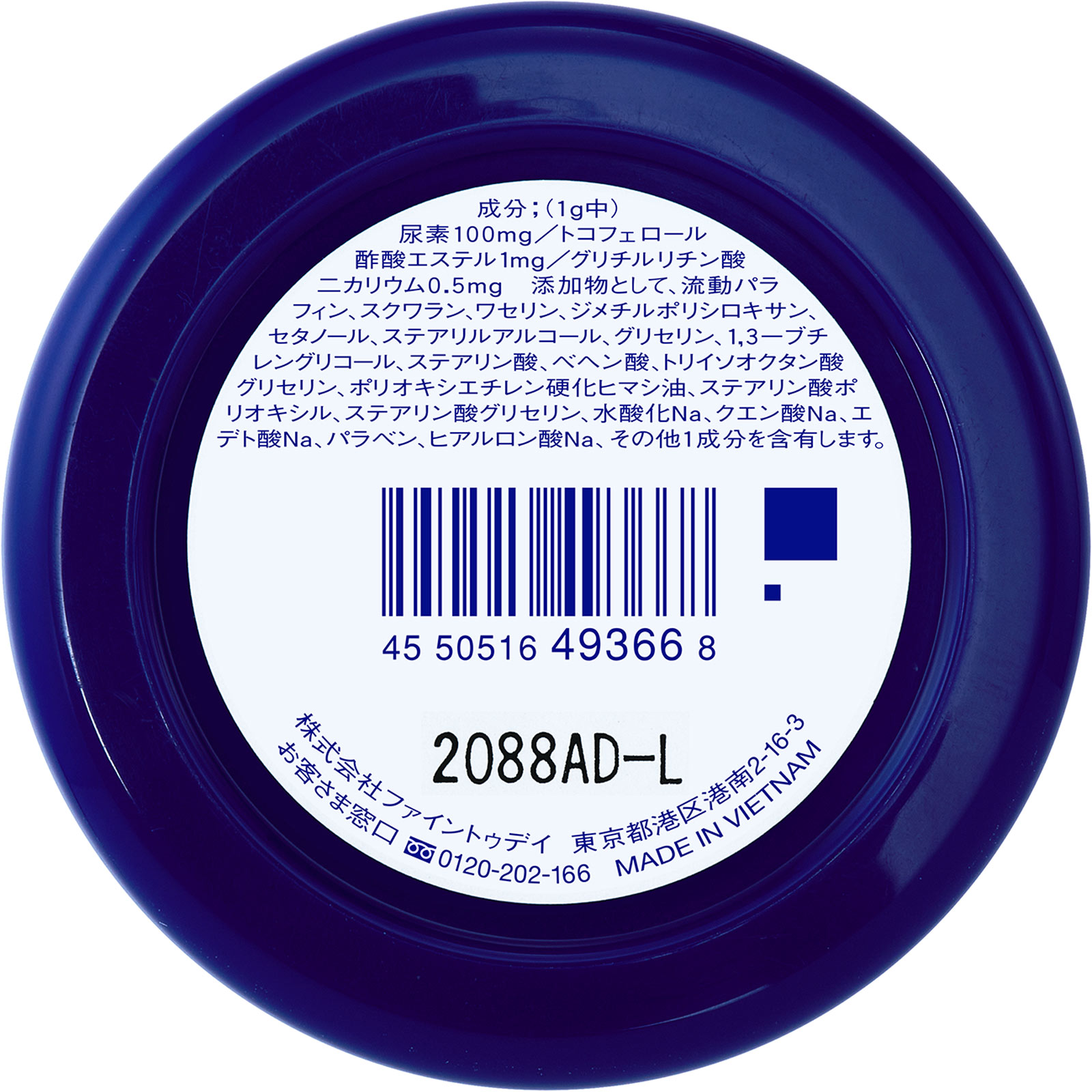 添加物として、流動パラフィン、スクワラン、ワセリン、ジメチルポリシロキサン、セタノール、ステアリルアルコール、グリセリン、1,3-ブチレングリコール、ステアリン酸、ベヘン酸、トリイソオクタン酸グリセリン、ポリオキシエチレン硬化ヒマシ油、ステアリン酸ポリオキシル、ステアリン酸グリセリン、水酸化Na、クエン酸Na、エデト酸Na、パラベン、ヒアルロン酸Na、その他1成分を含有します。