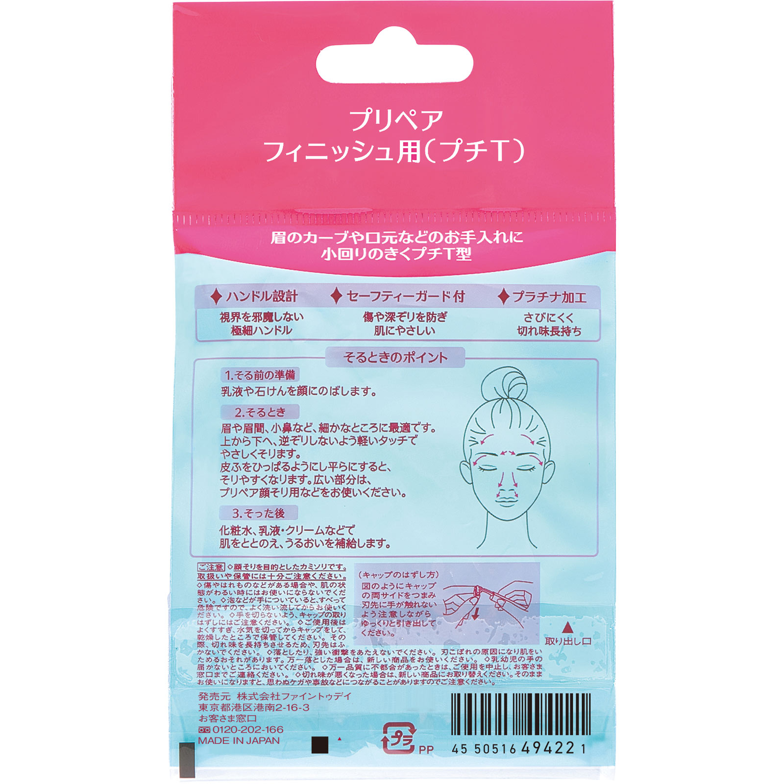 うぶ毛1本、逃さない!眉のカーブや口元などのお手入れに小回りのきくプチT型ハンドル設計:視界を邪魔しない極細ハンドルセーフティーガード付:傷や深ぞりを防ぎ肌にやさしいプラチナ加工:さびにくく切れ味長持ち