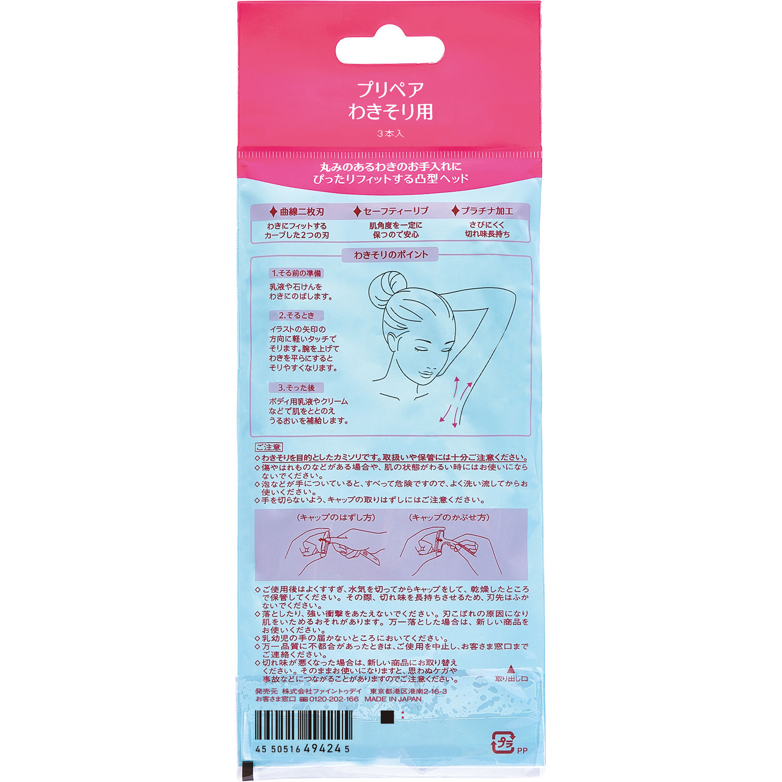 わきを、つるつる美肌に!わきの丸みにフィット丸みのあるわきのお手入れにぴったりフィットする凸型ヘッド曲線二枚刃:わきにフィットするカーブした2つの刃セーフティーリブ:肌角度を一定に保つので安心プラチナ加工:さびにくく切れ味長持ち
