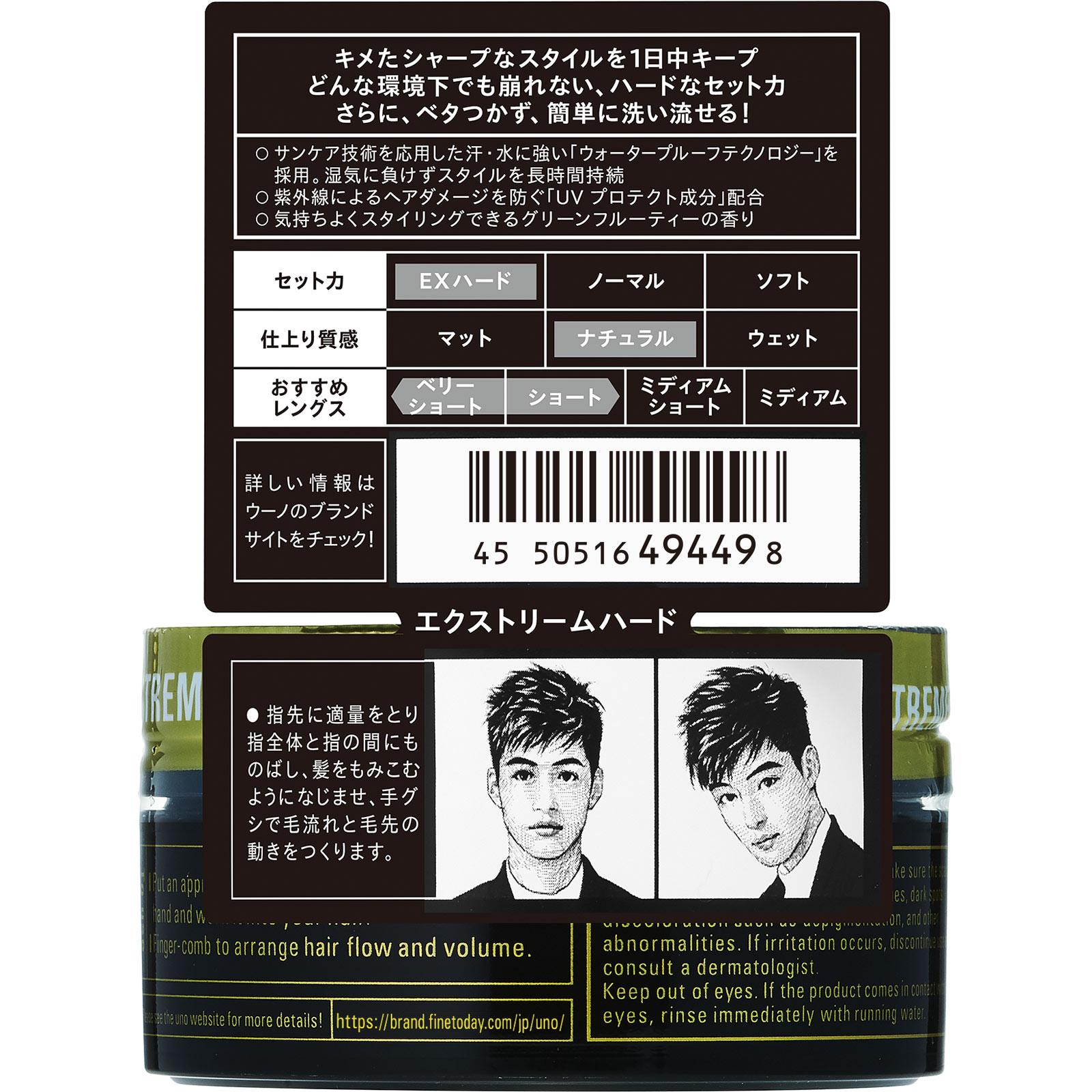 極ハードだから一日持続ウォータープルーフ処方キメたシャープなスタイルを1日中キープどんな環境下でも崩れない、ハードなセット力さらに、ベタつかず、簡単に洗い流せる!○サンケア技術を応用した汗・水に強い「ウォータープルーフテクノロジー」を採用。湿気に負けずスタイルを長時間持続○紫外線によるヘアダメージを防ぐ「UV プロテクト成分」配合○気持ちよくスタイリングできるグリーンフルーティーの香り