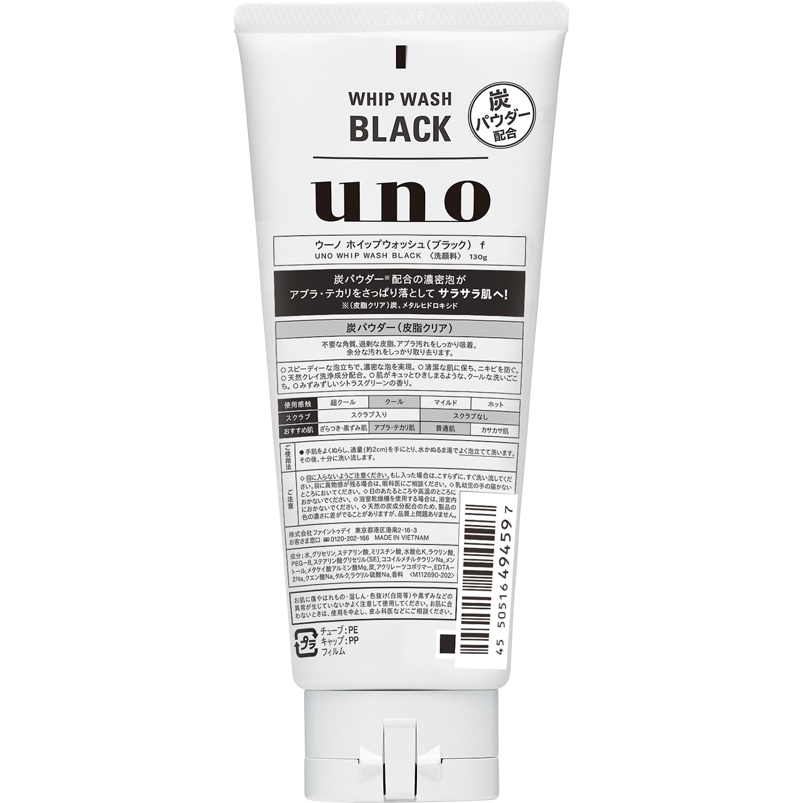 水,グリセリン,ステアリン酸,ミリスチン酸,水酸化K,ラウリン酸,PEG-8,ステアリン酸グリセリル(SE),ココイルメチルタウリンNa,メントール,メタケイ酸アルミン酸Mg,炭,アクリレーツコポリマー,EDTA-2Na,クエン酸Na,タルク,ラウリル硫酸Na,香料