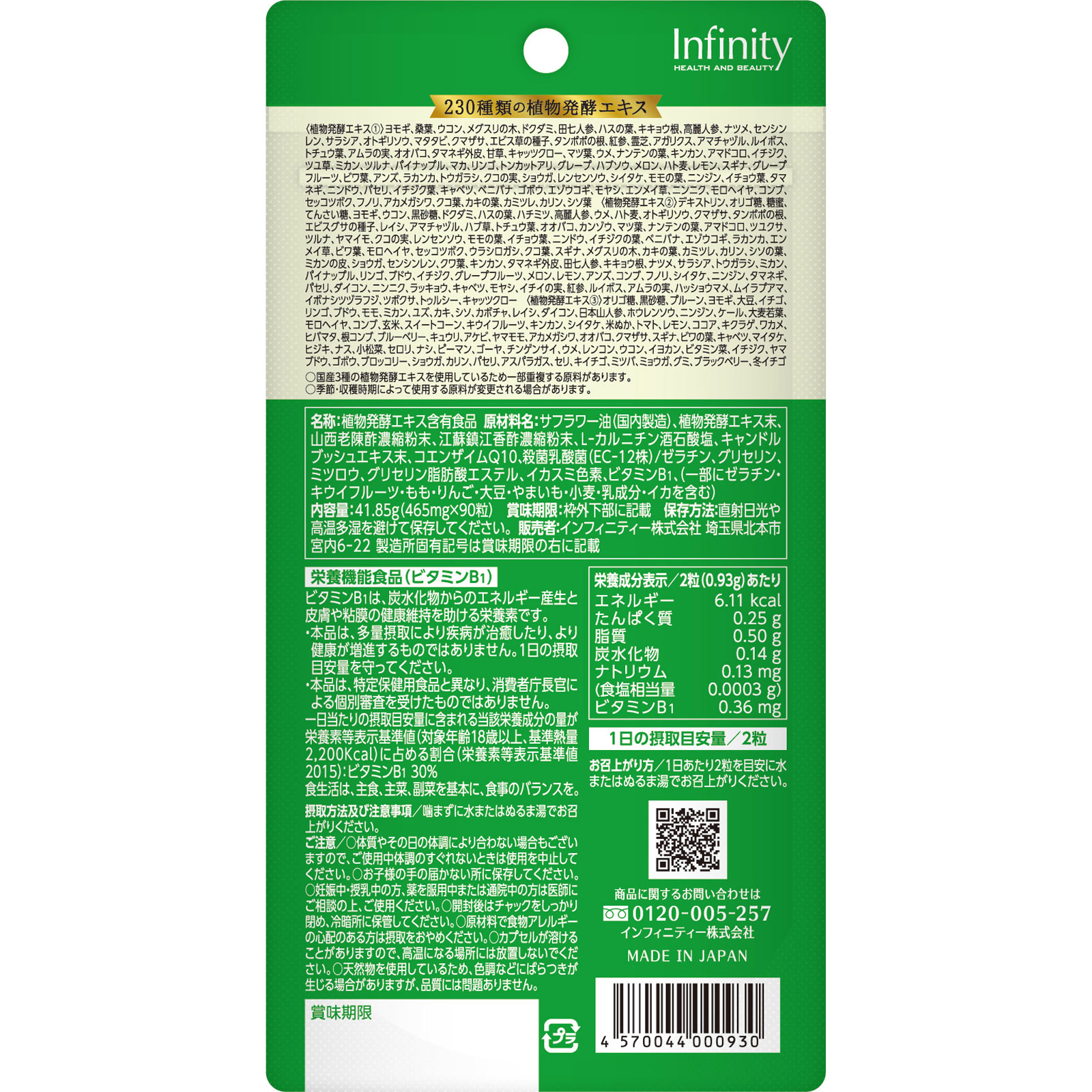 たっぷりサイズ大地の恵み100%○230種類の植物発酵エキス230種類の野草・野菜・果物などを国内で熟成発酵し、植物のちからをカプセルに凝縮。健康・美容にオススメの素材もプラス〈植物発酵エキス1.〉ヨモギ、桑葉、ウコン、メグスリの木、ドクダミ、田七人参、ハスの葉、キキョウ根、高麗人参、ナツメ、センシンレン、サラシア、オトギリソウ、マタタビ、クマザサ、エビス草の種子、タンポポの根、紅参、霊芝、アガリクス、アマチャヅル、ルイボス、トチュウ葉、アムラの実、オオバコ、タマネギ外皮、甘草、キャッツクロー、マツ葉、ウメ、ナンテンの葉、キンカン、アマドコロ、イチジク、ツユ草、ミカン、ツルナ、パイナップル、マカ、リンゴ、トンカットアリ、グレープ、ハブソウ、メロン、ハト麦、レモン、スギナ、グレープフルーツ、ビワ葉、アンズ、ラカンカ、トウガラシ、クコの実、ショウガ、レンセンソウ、シイタケ、モモの葉、ニンジン、イチョウ葉、タマネギ、ニンドウ、パセリ、イチジク葉、キャベツ、ベニバナ、ゴボウ、エゾウコギ、モヤシ、エンメイ草、ニンニク、モロヘイヤ、コンブ、セッコツボク、フノリ、アカメガシワ、クコ葉、カキの葉、カミツレ、カリン、シソ葉〈植物発酵エキス2.〉デキストリン、オリゴ糖、糖蜜、てんさい糖、ヨモギ、ウコン、黒砂糖、ドクダミ、ハスの葉、ハチミツ、高麗人参、ウメ、ハト麦、オトギリソウ、クマザサ、タンポポの根、エビスグサの種子、レイシ、アマチャヅル、ハブ草、トチュウ葉、オオバコ、カンゾウ、マツ葉、ナンテンの葉、アマドコロ、ツユクサ、ツルナ、ヤマイモ、クコの実、レンセンソウ、モモの葉、イチョウ葉、ニンドウ、イチジクの葉、ベニバナ、エゾウコギ、ラカンカ、エンメイ草、ビワ葉、モロヘイヤ、セッコツボク、ウラシロガシ、クコ葉、スギナ、メグスリの木、カキの葉、カミツレ、カリン、シソの葉、ミカンの皮、ショウガ、センシンレン、クワ葉、キンカン、タマネギ外皮、田七人参、キキョウ根、ナツメ、サラシア、トウガラシ、ミカン、パイナップル、リンゴ、ブドウ、イチジク、グレープフルーツ、メロン、レモン、アンズ、コンブ、フノリ、シイタケ、ニンジン、タマネギ、パセリ、ダイコン、ニンニク、ラッキョウ、キャベツ、モヤシ、イチイの実、紅参、ルイボス、アムラの実、ハッショウマメ、ムイラプアマ、イボナシツヅラフジ、ツボクサ、トゥルシー、キャッツクロー〈植物発酵エキス3.〉オリゴ糖、黒砂糖、プルーン、ヨモギ、大豆、イチゴ、リンゴ、ブドウ、モモ、ミカン、ユズ、カキ、シソ、カボチャ、レイシ、ダイコン、日本山人参、ホウレンソウ、ニンジン、ケール、大麦若葉、モロヘイヤ、コンブ、玄米、スイートコーン、キウイフルーツ、キンカン、シイタケ、米ぬか、トマト、レモン、ココア、キクラゲ、ワカメ、ヒバマタ、根コンブ、ブルーベリー、キュウリ、アケビ、ヤマモモ、アカメガシワ、オオバコ、クマザサ、スギナ、ビワの葉、キャベツ、マイタケ、ヒジキ、ナス、小松菜、セロリ、ナシ、ピーマン、ゴーヤ、チンゲンサイ、ウメ、レンコン、ウコン、イヨカン、ビタミン菜、イチジク、ヤマブドウ、ゴボウ、ブロッコリー、ショウガ、カリン、パセリ、アスパラガス、セリ、キイチゴ、ミツバ、ミョウガ、グミ、ブラックベリー、冬イチゴ○国産3種の植物発酵エキスを使用しているため一部重複する原料があります。○季節・収穫時期によって使用する原料が変更される場合があります。栄養機能食品(ビタミンB1)
