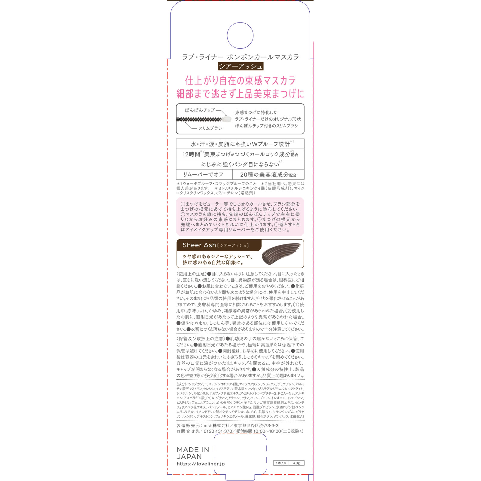 束感仕上がり12hカール仕上がり自在の束感マスカラ細部まで逃さず上品美束まつげに束感まつげに特化したラブ・ライナーだけのオリジナル形状ぽんぽんチップ付きのスリムブラシ水・汗・涙・皮脂にも強いWプルーフ設計*112時間*2美束まつげがつづくカールロック成分*3配合にじみに強くパンダ目にならない*2リムーバーでオフ20種の美容液成分配合*1 ウォータプルーフ・スマッジプルーフのこと*2 当社調べ。効果には個人差があります。*3 トリメチルシロキシケイ酸(皮膜形成剤)、マイクロクリスタリンワックス、ポリエチレン(増粘剤)ツヤ感のあるシアーなアッシュで、抜け感のある自然な印象に。