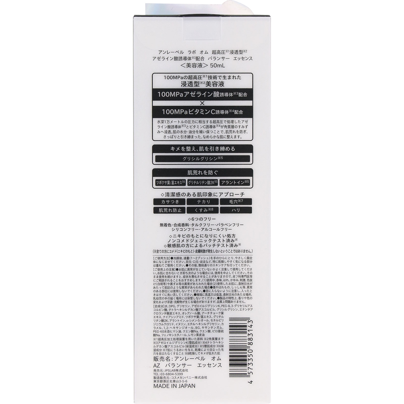 大人の肌管理※1コスメ洗顔後すぐ使う導入美容液清潔感あふれる好印象肌にカサつき テカリ 毛穴 ※2肌荒れ防止 くすみ※3 ハリアゼライン酸誘導体10%* ビタミンC誘導体5%※4※1 肌を整えること※2 肌にうるおいを与え、乾燥により目立った毛穴を目立たなくすること※3 乾燥してキメが乱れた肌※4 テトラヘキシルデカン酸アスコルビル、3-グリセリルアスコルビン酸(保湿成分)を含む原料として合わせて5%配合*アゼロイルジグリシンK(整肌成分)を含む原料として10%配合100MPaの超高圧※1技術で生まれた浸透型※2美容液100MPaアゼライン酸誘導体※3配合100MPaビタミンC誘導体※4配合水深1万メートルの圧力に相当する超高圧で処理したアゼライン酸誘導体※3とビタミンC誘導体※4が角質層のすみずみへ浸透。肌の水分・油分を補い保つことで、肌荒れを防ぎ、さっぱりと引き締まった、なめらかな肌に整えます。キメを整え、肌を引き締めるグリシルグリシン※5肌荒れを防ぐツボクサ葉/茎エキス※6 グリチルリチン酸2K※5 アラントイン※5◇清潔感のある肌印象にアプローチカサつき テカり 毛穴※7肌荒れ防止 くすみ※8 ハリ◇6つのフリー無着色・合成香料・タルクフリー・パラベンフリーシリコンフリー・アルコールフリー◇ニキビのもとになりにくい処方ノンコメドジェニックテスト済み※◇敏感肌の方によるパッチテスト済み※(※全ての方にコメド(ニキビのもと)・皮膚刺激が発生しないということではありません。)※1 超高圧加工処理装置を用いた原料※2 角質層まで※3 アゼロイルジグリシンK(整肌成分)※4 テトラヘキシルデカン酸アスコルビル(保湿成分)※5 整肌成分※6 保湿成分※7 肌にうるおいを与え、乾燥により目立った毛穴を目立たなくすること※8 乾燥してキメが乱れた肌