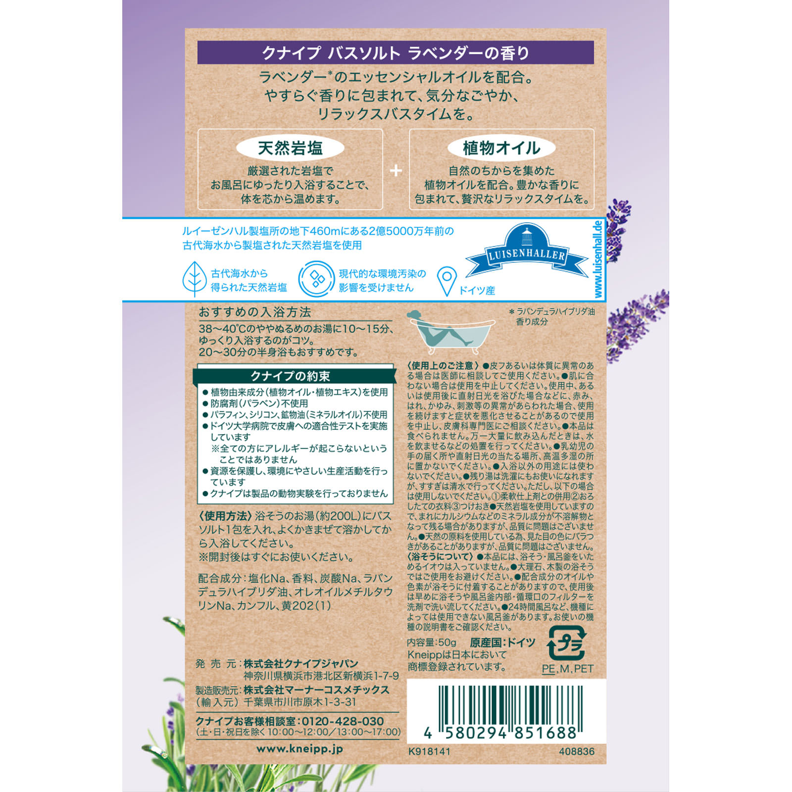 芳香浴で気分をリラックス天然岩塩・天然エッセンシャルオイルラベンダー*のエッセンシャルオイルを配合。やすらぐ香りに包まれて、気分なごやか、リラックスバスタイムを。○天然岩塩厳選された岩塩でお風呂にゆったり入浴することで、体を芯から温めます。○植物オイル自然のちからを集めた植物オイル・植物エキスを配合。豊かな香りに包まれて、贅沢なリラックスタイムを。ルイーゼンハル製塩所の地下460mにある2億5000万年前の古代海水から製塩された天然岩塩を使用・古代海水から得られた天然岩塩・現代的な環境汚染の影響を受けません*ラバンデュラハイブリダ油 香り成分〔クナイプの約束〕●植物由来成分(植物オイル・植物エキス)を使用●防腐剤(パラベン)不使用●パラフィン、シリコン、鉱物油(ミネラルオイル)不使用●ドイツ大学病院で皮膚への適合性テストを実施しています※全ての方にアレルギーが起こらないということではありません●クナイプは製品の動物実験を行っておりません