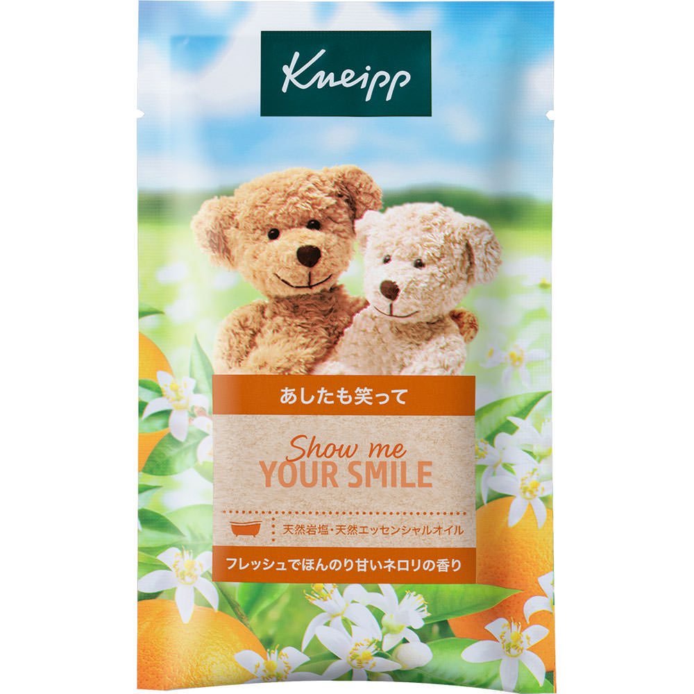 あしたも笑って天然岩塩・天然エッセンシャルオイル柑橘系の明るさとフローラルのやわらかさをあわせもつ、ネロリの精油*を配合。やさしくてどこか懐かしい香りに包まれて、晴れやかな楽園でリラックスするようなバスタイムを。○天然岩塩厳選された岩塩でお風呂にゆったり入浴することで、体を芯から温めます。○植物オイル自然のちからを集めた植物オイル・植物エキスを配合。豊かな香りに包まれて、贅沢なリラックスタイムを。*ビターオレンジ花油香り成分〔クナイプの約束〕●植物由来成分(植物オイル・植物エキス)を使用●防腐剤(パラベン)不使用●パラフィン、シリコン、鉱物油(ミネラルオイル)不使用●ドイツ大学病院で皮膚への適合性テストを実施しています※全ての方にアレルギーが起こらないということではありません●クナイプは製品の動物実験を行っておりません