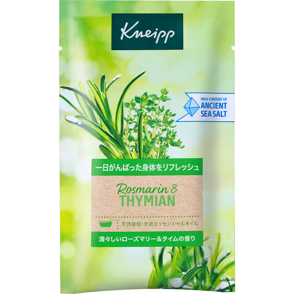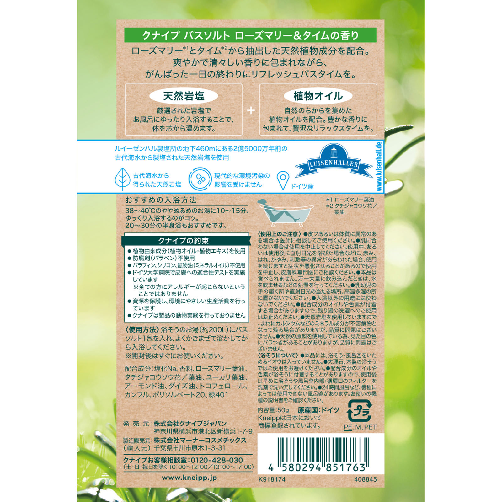 天然岩塩・天然エッセンシャルオイルローズマリー*1とタイム*2から抽出した天然植物成分を配合。爽やかで清々しい香りに包まれながら、がんばった一日の終わりにリフレッシュバスタイムを。○天然岩塩厳選された岩塩でお風呂にゆったり入浴することで、体を芯から温めます。○植物オイル自然のちからを集めた植物オイル・植物エキスを配合。豊かな香りに包まれて、贅沢なリラックスタイムを。ルイーゼンハル製塩所の地下460mにある2億5000万年前の古代海水から製塩された天然岩塩を使用・古代海水から得られた天然岩塩・現代的な環境汚染の影響を受けません*1 ローズマリー葉油*2 タチジャコウソ花/葉油〔クナイプの約束〕●植物由来成分(植物オイル・植物エキス)を使用●防腐剤(パラベン)不使用●パラフィン、シリコン、鉱物油(ミネラルオイル)不使用●ドイツ大学病院で皮膚への適合性テストを実施しています※全ての方にアレルギーが起こらないということではありません●クナイプは製品の動物実験を行っておりません