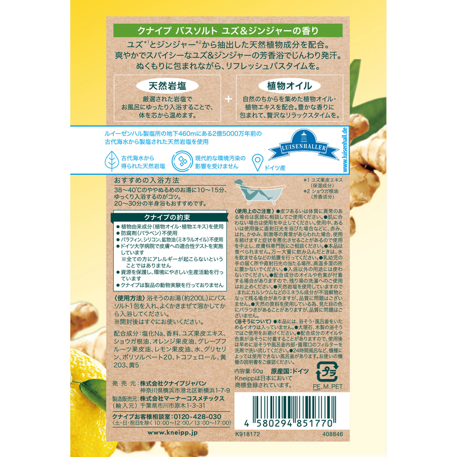 全身にぬくもり巡る発汗バスタイム天然岩塩・天然エッセンシャルオイルユズ*1とジンジャー*2から抽出した天然植物成分を配合。爽やかでスパイシーなユズ&ジンジャーの芳香浴でじんわり発汗。ぬくもりに包まれながら、リフレッシュバスタイムを。○天然岩塩厳選された岩塩でお風呂にゆったり入浴することで、体を芯から温めます。○植物オイル自然のちからを集めた植物オイル・植物エキスを配合。豊かな香りに包まれて、贅沢なリラックスタイムを。ルイーゼンハル製塩所の地下460mにある2億5000万年前の古代海水から製塩された天然岩塩を使用・古代海水から得られた天然岩塩・現代的な環境汚染の影響を受けません*1 ユズ果皮エキス(保湿成分)*2 ショウガ根油(芳香成分)〔クナイプの約束〕●植物由来成分(植物オイル・植物エキス)を使用●防腐剤(パラベン)不使用●パラフィン、シリコン、鉱物油(ミネラルオイル)不使用●ドイツ大学病院で皮膚への適合性テストを実施しています※全ての方にアレルギーが起こらないということではありません●クナイプは製品の動物実験を行っておりません