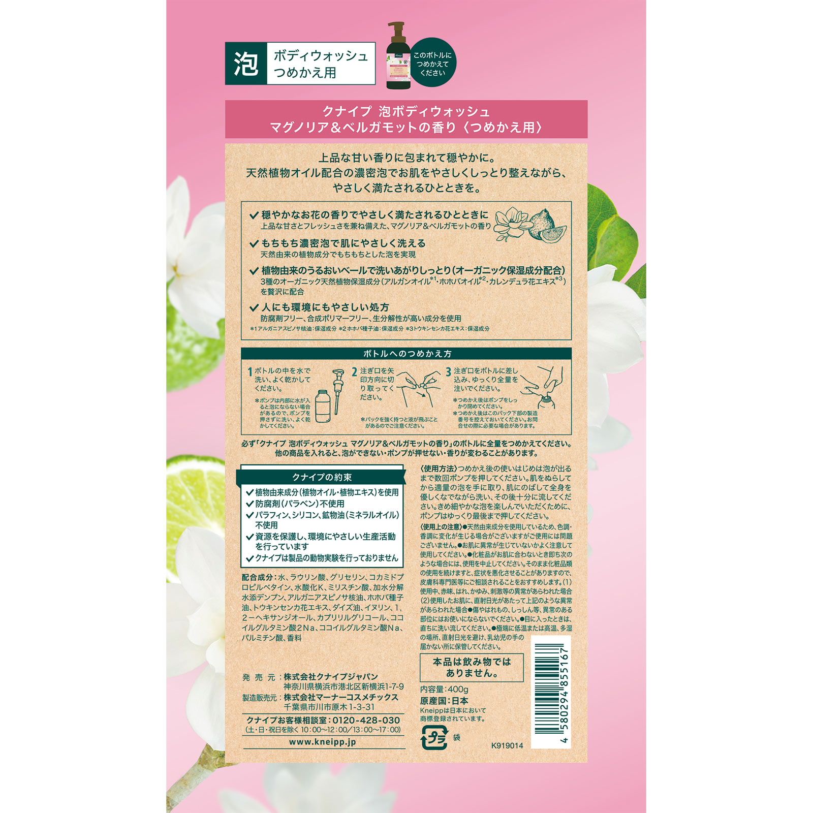自然の香りに包まれて贅沢なひとときを植物由来のうるおいベールでしっとり肌へきめ細かな泡対応オーガニック天然植物オイル配合上品で穏やかなマグノリア&ベルガモットの香り上品な甘い香りに包まれて穏やかに。天然植物オイル配合の濃密泡でお肌をやさしくしっとり整えながら、やさしく満たされるひとときを。○穏やかなお花の香りでやさしく満たされるひとときに上品な甘さとフレッシュさを兼ね備えた、マグノリア&ベルガモットの香り○もちもち濃密泡で肌にやさしく洗える天然由来の植物成分でもちもちとした泡を実現○植物由来のうるおいベールで洗いあがりしっとり(オーガニック保湿成分配合)3種のオーガニック天然植物保湿成分(アルガンオイル*1・ホホバオイル*2・カレンデュラ花エキス*3)を贅沢に配合○人にも環境にもやさしい処方防腐剤フリー、合成ポリマーフリー、生分解性が高い成分を使用*1 アルガニアスピノサ核油:保湿成分*2 ホホバ種子油:保湿成分*3 トウキンセンカ花エキス:保湿成分クナイプの約束●植物由来成分(植物オイル・植物エキス)を使用●防腐剤(パラベン)不使用●パラフィン、シリコン、鉱物油(ミネラルオイル)不使用●資源を保護し、環境にやさしい生産活動を行っています●クナイプは製品の動物実験を行っておりません