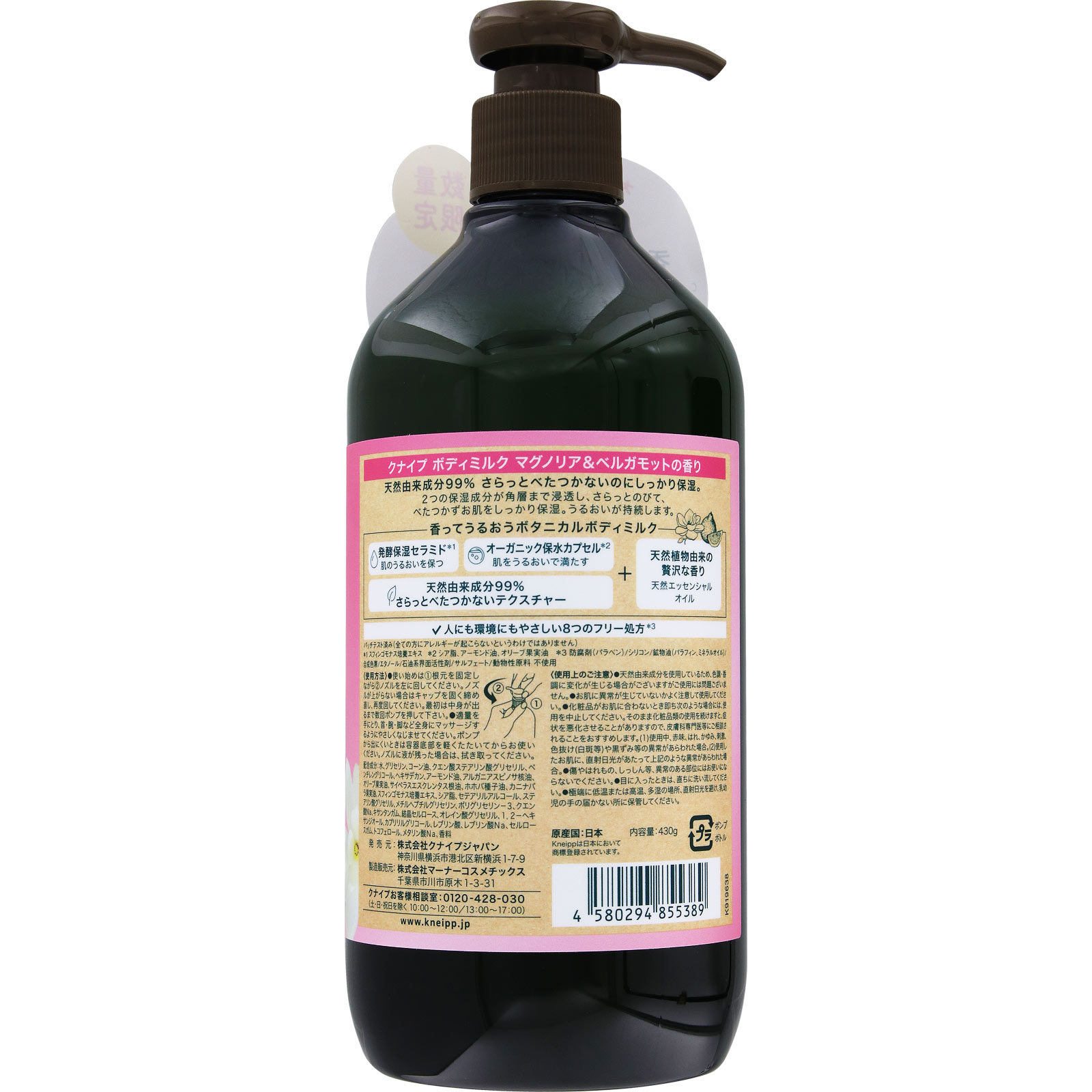 大容量430g香りに癒される上品な甘さのマグノリア&ベルガモットの香りベタつかないのにしっかり保湿やさしく満たされるひととき発酵保湿セラミド*1&オーガニック保水カプセル*2配合天然由来成分99% さらっとべたつかないのにしっかり保湿。2つの保湿成分が角層まで浸透し、さらっとのびて、べたつかずお肌をしっかり保湿。うるおいが持続します。香ってうるおうボタニカルボディミルク発酵保湿セラミド*1:肌のうるおいを保つオーガニック保水カプセル*2:肌をうるおいで満たす天然由来成分99% さらっとべたつかないテクスチャー天然植物由来の贅沢な香り:天然エッセンシャルオイル人にも環境にもやさしい8つのフリー処方*3パッチテスト済み(全ての方にアレルギーが起こらないというわけではありません)*1 スフィンゴモナス培養エキス*2 シア脂、アーモンド油、オリーブ果実油*3 防腐剤(パラベン)/シリコン/鉱物油(パラフィン、ミネラルオイル)/合成色素/エタノール/石油系界面活性剤/サルフェート/動物性原料 不使用