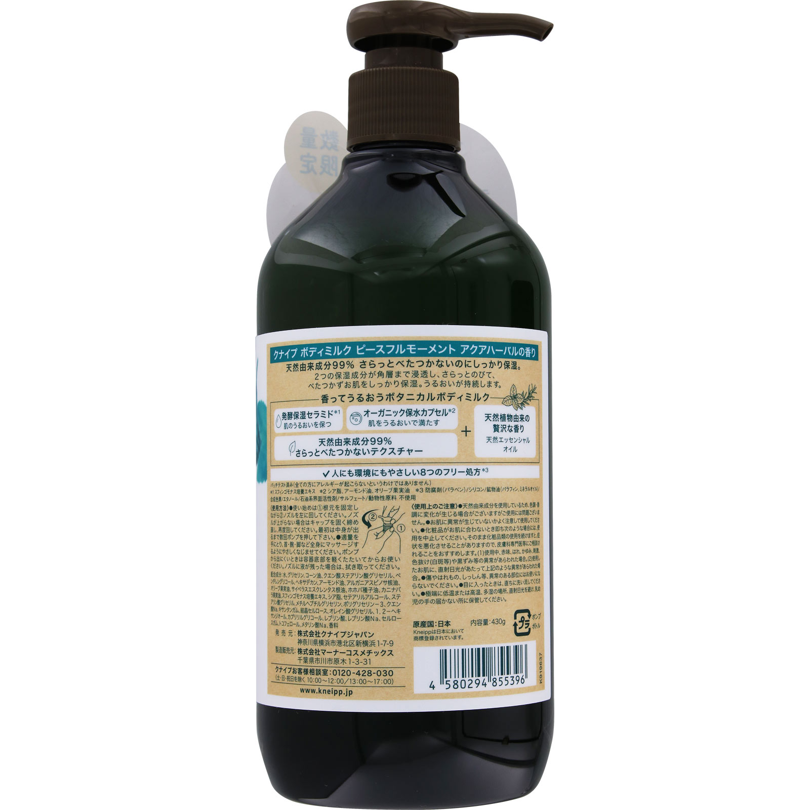 大容量430g香りに癒されるベタつかないのにしっかり保湿心おだやかに満たされる時間発酵保湿セラミド*1&オーガニック保水カプセル*2配合みずみずしく爽やかなアクアハーバルの香り天然由来成分99% さらっとべたつかないのにしっかり保湿。2つの保湿成分が角層まで浸透し、さらっとのびて、べたつかずお肌をしっかり保湿。うるおいが持続します。香ってうるおうボタニカルボディミルク発酵保湿セラミド*1:肌のうるおいを保つオーガニック保水カプセル*2:肌をうるおいで満たす天然由来成分99% さらっとべたつかないテクスチャー天然植物由来の贅沢な香り:天然エッセンシャルオイル人にも環境にもやさしい8つのフリー処方*3パッチテスト済み(全ての方にアレルギーが起こらないというわけではありません)*1 スフィンゴモナス培養エキス*2 シア脂、アーモンド油、オリーブ果実油*3 防腐剤(パラベン)/シリコン/鉱物油(パラフィン、ミネラルオイル)/合成色素/エタノール/石油系界面活性剤/サルフェート/動物性原料 不使用