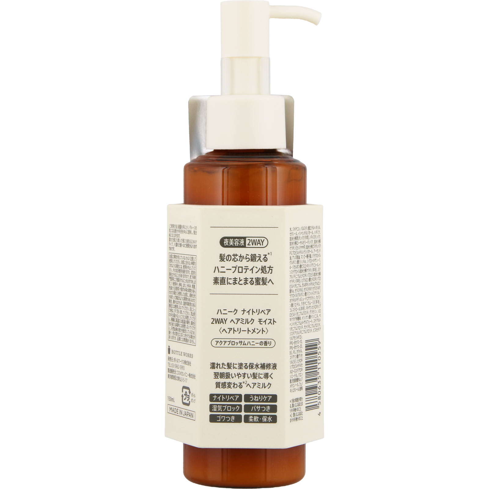 夜に仕込み、質感変わる*密髪ヘアミルクナイトハニープロテイン処方夜のうねり・くせ 蓄積ダメージ*潤いによるまとまりや手触りのこと夜美容液髪の芯から鍛える*1ハニープロテイン処方 素直にまとまる密髪へアクアブロッサムハニーの香り濡れた髪に塗る保水補修液翌朝扱いやすい髪に導く質感変わるヘアミルクナイトリペア うねりケア 湿気ブロック パサつき ゴワつき 柔軟・保水*1 髪の質感が変わる、潤いによるまとまりや手触りのこと