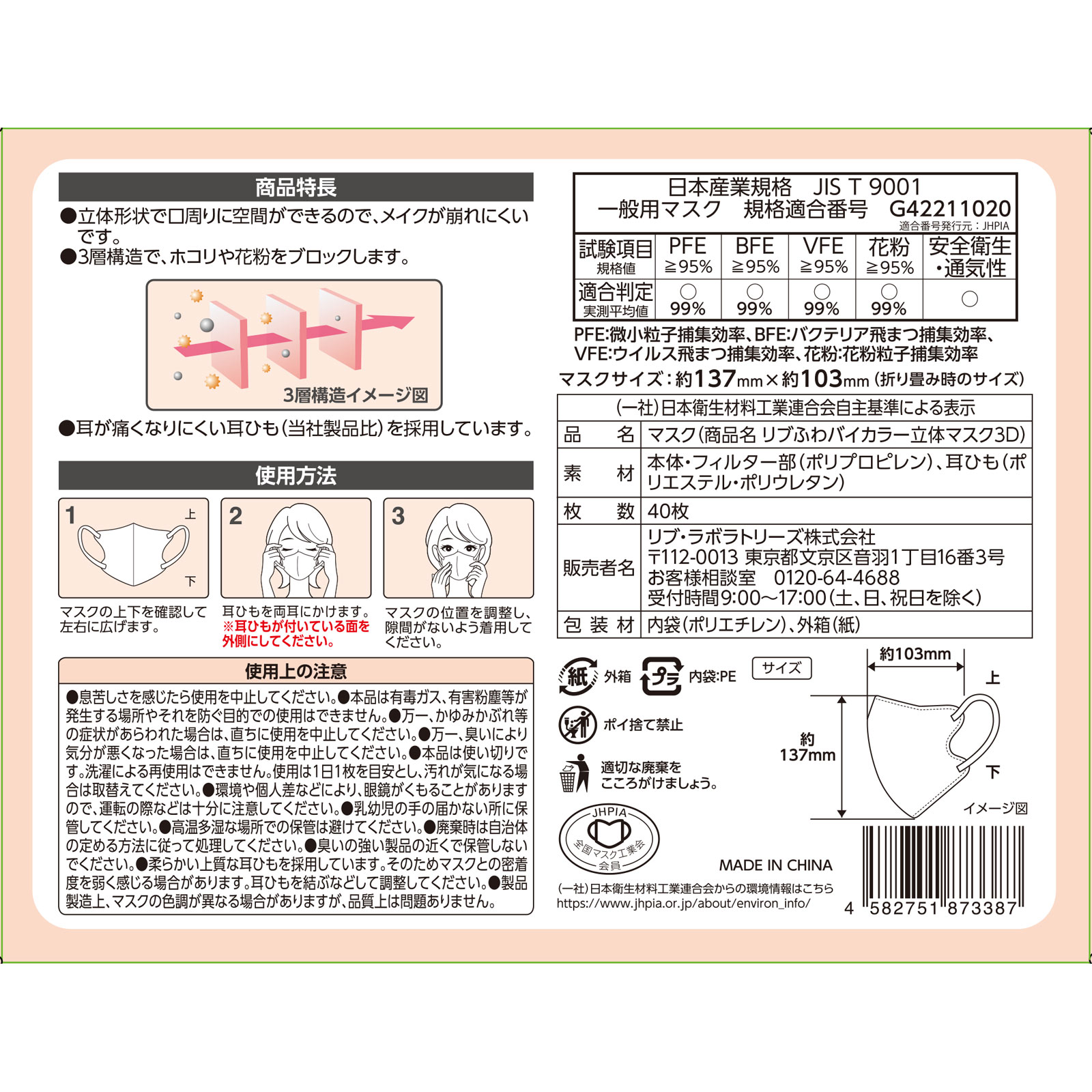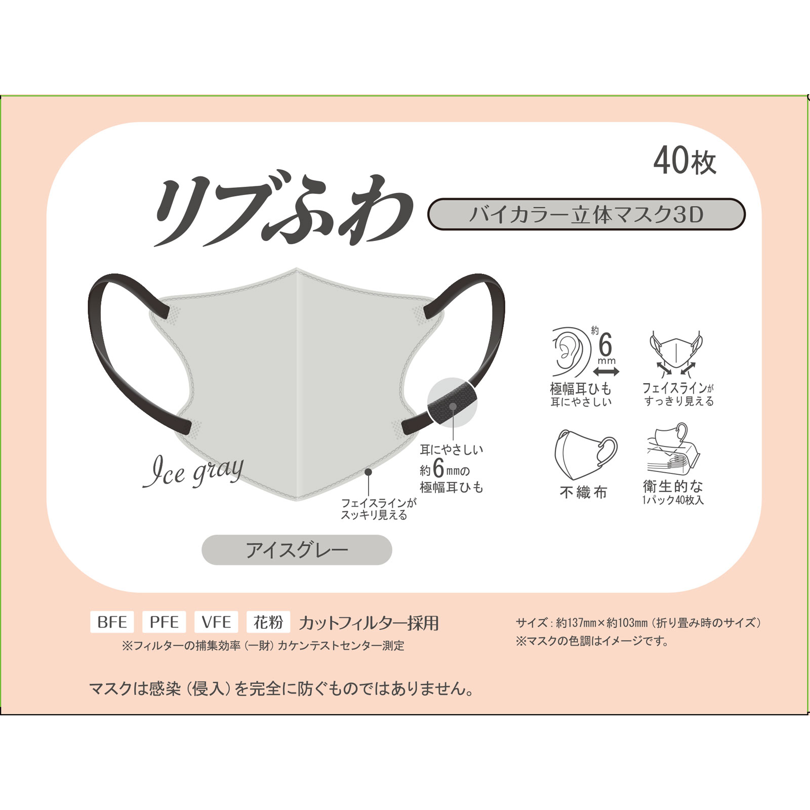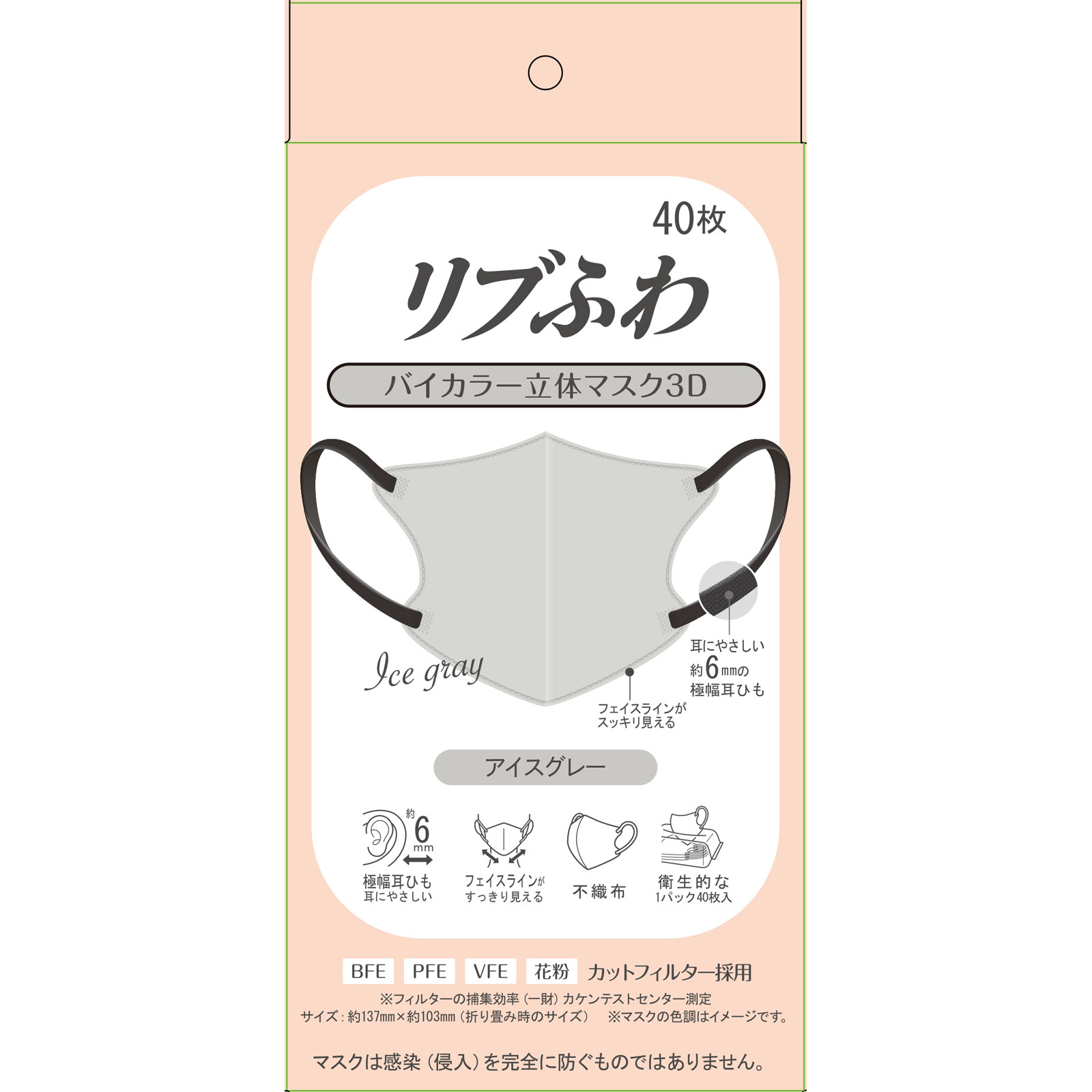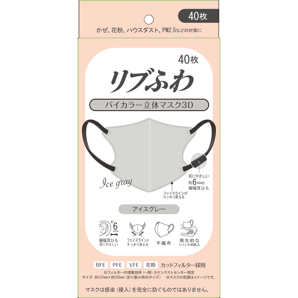 かぜ、花粉、ハウスダスト、PM2.5などの対策に耳にやさしい約6mm極幅耳ひもフェイスラインがすっきり見える 不織布 衛生的な1パック40枚入BFE PFE VFE 花粉 カットフィルター採用※フィルターの捕集効率(一財)カケンテストセンター測定●立体形状で口周りに空間ができるので、メイクが崩れにくいです。●3層構造で、ホコリや花粉をブロックします。●耳が痛くなりにくい耳ひも(当社製品比)を採用しています。PFE:微小粒子捕集効率、BFE:バクテリア飛まつ捕集効率、VFE:ウイルス飛まつ捕集効率、花粉:花粉粒子捕集効率マスクサイズ:約137mm×約103mm(折り畳み時のサイズ)