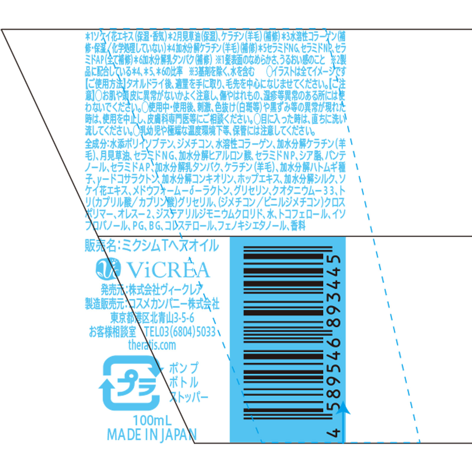水添ポリイソブテン、ジメチコン、水溶性コラーゲン、加水分解ケラチン(羊毛)、月見草油、セラミドNG、加水分解ヒアルロン酸、セラミドNP、シア脂、パンテノール、セラミドAP、加水分解乳タンパク、ケラチン(羊毛)、加水分解ハトムギ種子、γ-ドコサラクトン、加水分解コンキオリン、ホップエキス、加水分解シルク、ソケイ花エキス、メドウフォーム-δ-ラクトン、グリセリン、クオタニウム-33、トリ(カプリル酸/カプリン酸)グリセリル、(ジメチコン/ビニルジメチコン)クロスポリマー、オレス-2、ジステアリルジモニウムクロリド、水、トコフェロール、イソプロパノール、PG、BG、コレステロール、フェノキシエタノール、香料
