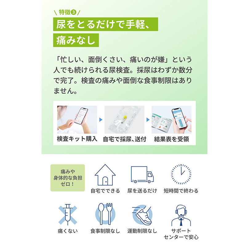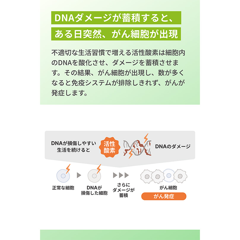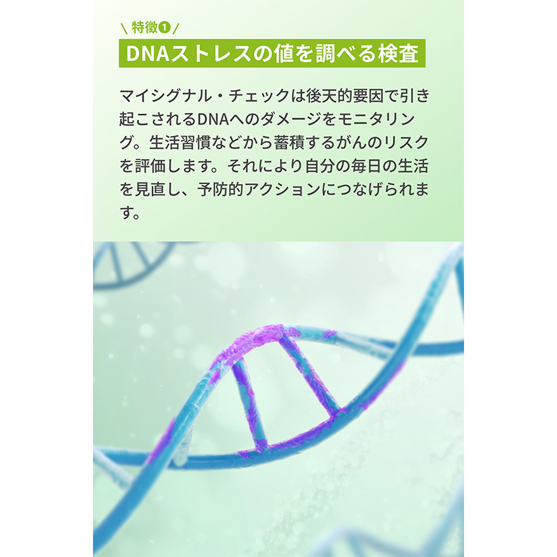 「DNAストレスを下げ、がんリスクを低減」 マイシグナル・チェックは、今のあなたのDNAストレス値を見る尿検査。 毎日、がんの原因を作っていないか? 体内で生じる活性酸素が日々、DNAにどれだけストレスを与えているかを判定します。 いつもの何気ない生活習慣で、がん対策を。