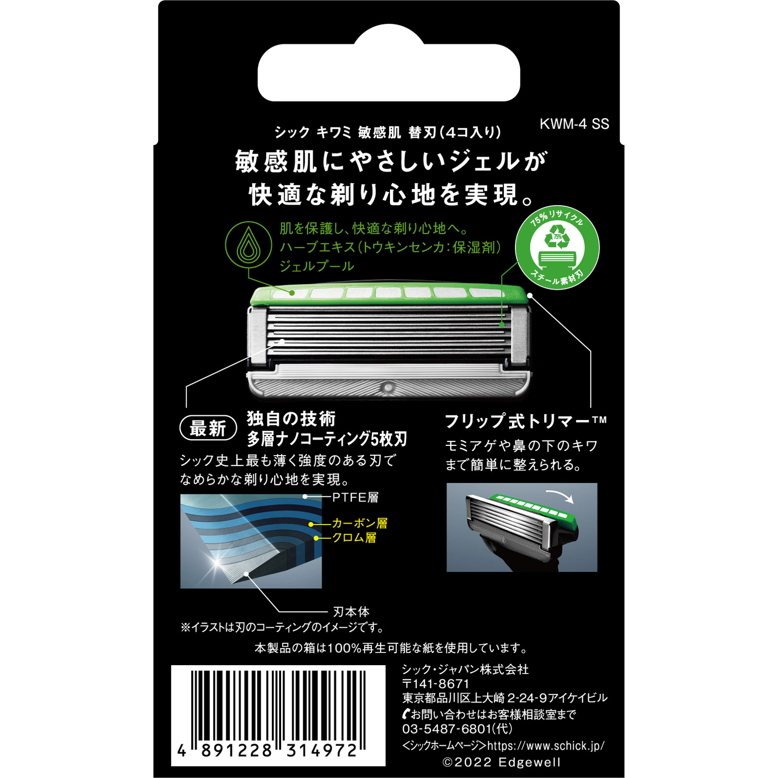 敏感肌用*1*1 皮膚学的な皮膚刺激テスト済み(全ての人に刺激がおきないというわけではありません)敏感肌にやさしいジェルが快適な剃り心地を実現。○肌を保護し、快適な剃り心地へ。ハーブエキス(トウキンセンカ:保湿剤)ジェルプール○75%リサイクル スチール素材刃○最新 独自の技術 多層ナノコーティング5枚刃シック史上最も薄く強度のある刃でなめらかな剃り心地を実現。○フリップ式トリマーモミアゲや鼻の下のキワまで簡単に整えられる。
