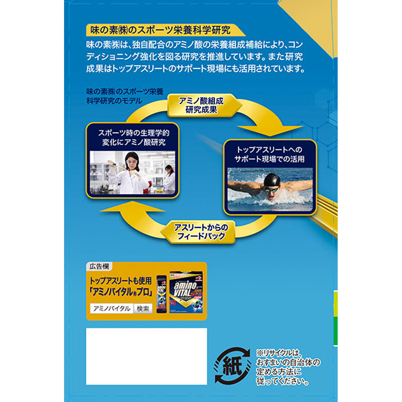 カラダを動かすすべての人にとって大切なアミノ酸とビタミンが配合され、味の素(株)独自のおいしさ技術を活用した飲みやすさに優れたスポーツサプリメントです。
