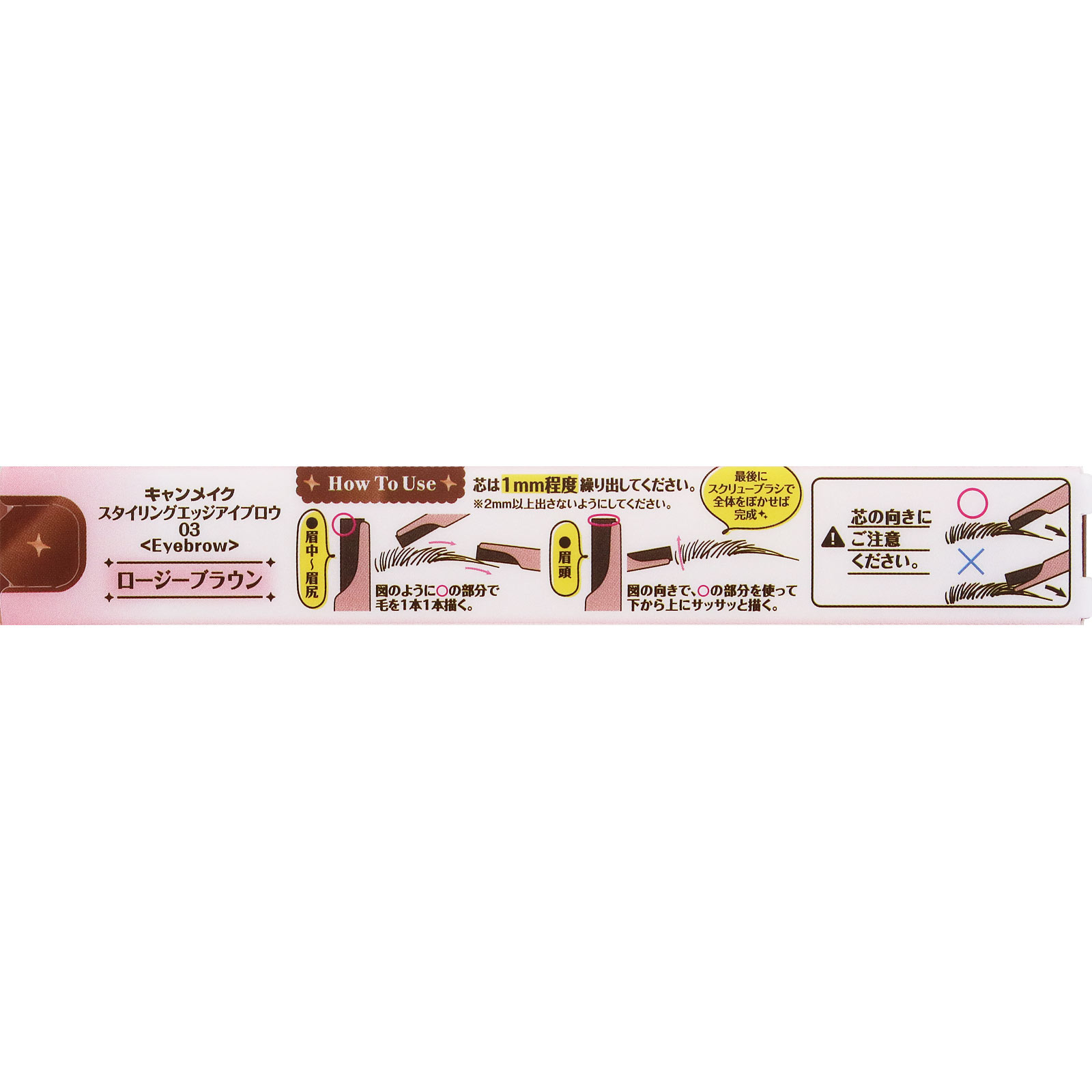 こだわりの薄型芯アイブロウ眉毛1本1本スッっと超描きやすい驚きの薄さ0.8mmブラシ付き描きやすい薄型芯細い線が描ける 極薄0.8mmブレずに安定 幅広4.0mm・細い線でもブレずにスッと描ける!・肌に触れる芯の面が大きいので、安定!・軽いタッチでもしっかり高発色!・水、汗、皮脂、こすれにも強く、消えやすい眉尻もしっかりキープ!