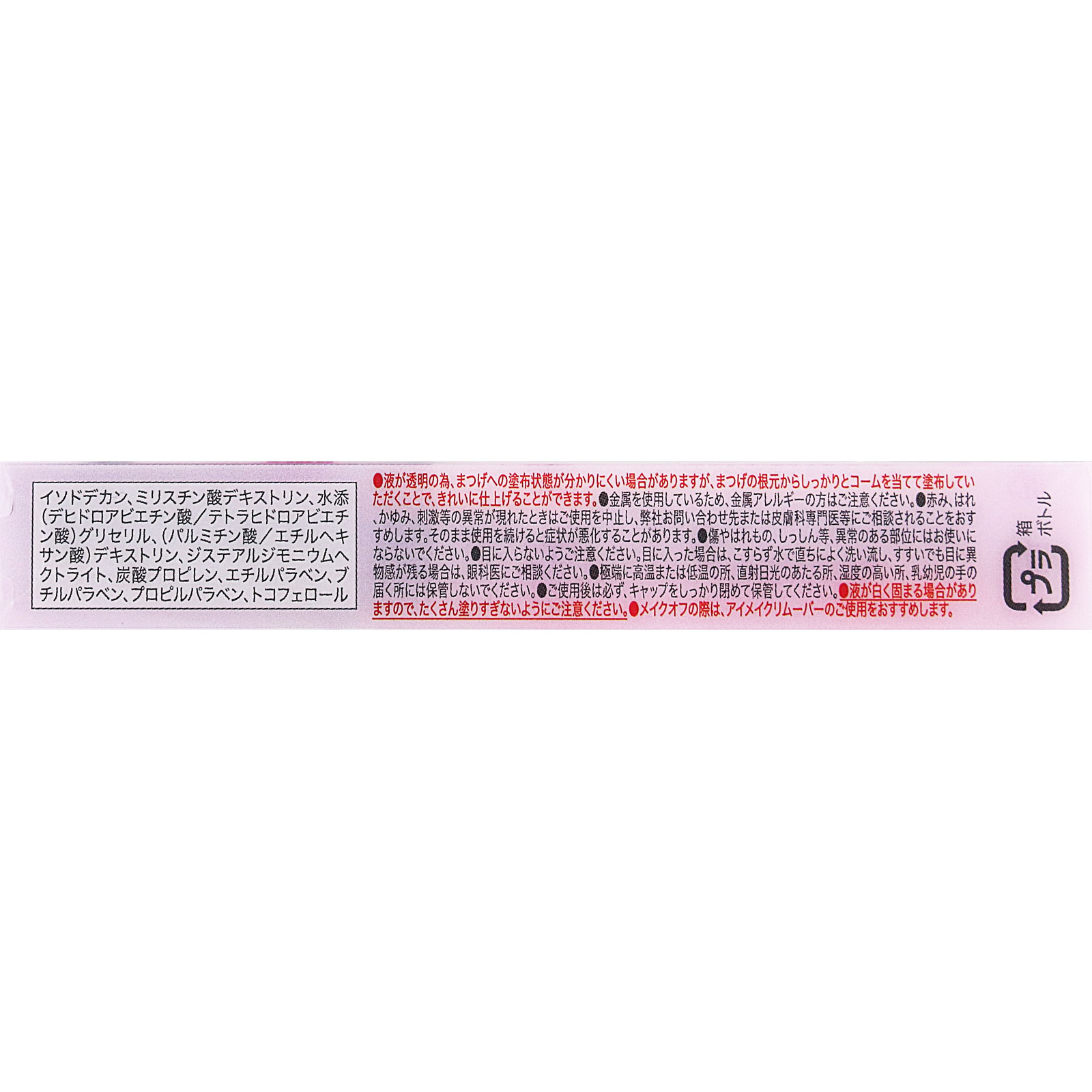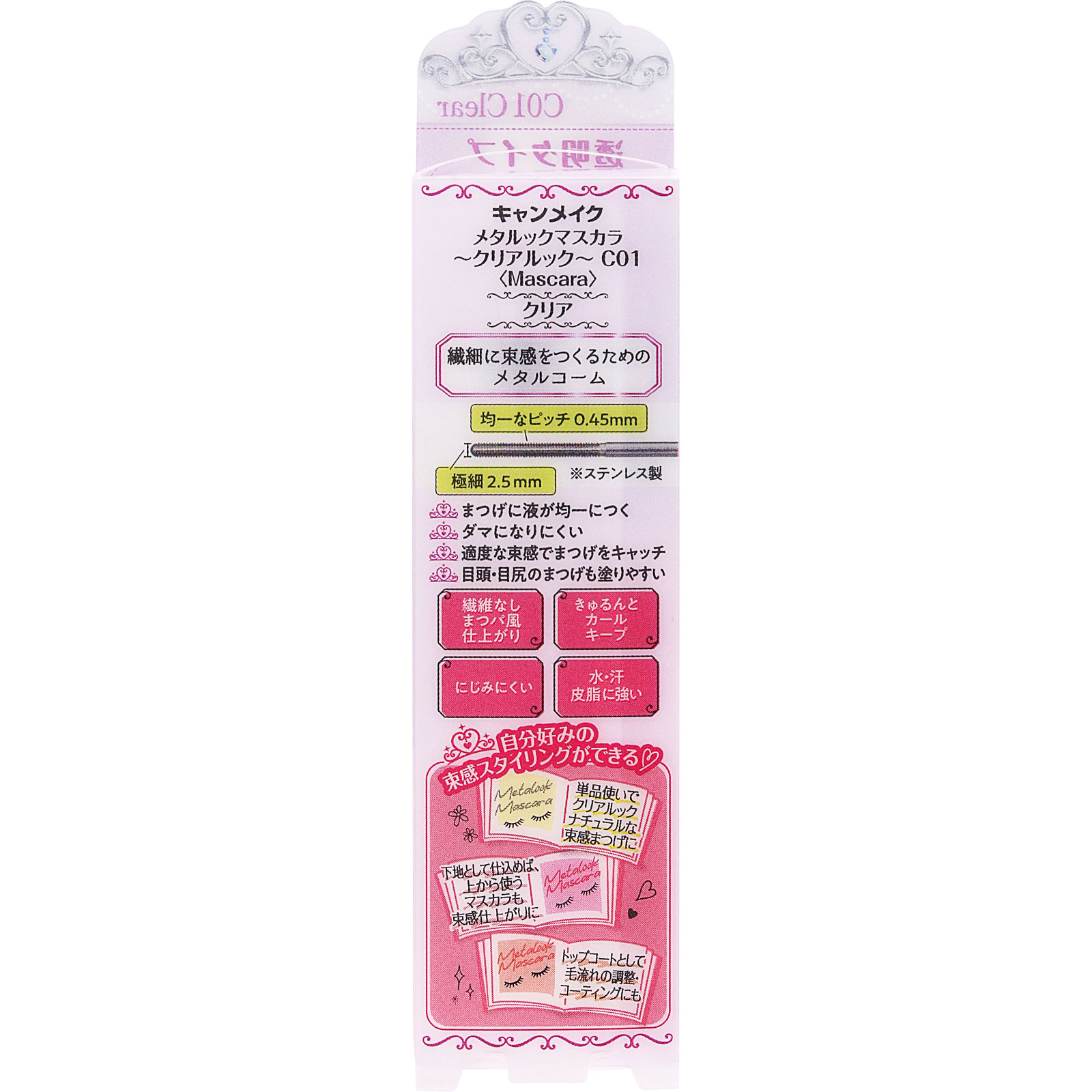 透明タイプメタルコームで束感のある美まつげクリアマスカラ束感をつくる下地簡単塗りやすい繊細に束感をつくるためのメタルコーム均一なピッチ0.45mm極細2.5mm※ステンレス製まつげに液が均一につくダマになりにくい適度な束感でまつげをキャッチ目頭・目尻のまつげも塗りやすい繊維なしまつパ風仕上がりきゅるんとカールキープにじみにくい水・汗 皮脂に強い自分好みの束感スタイリングができる・単品使いでクリアルックナチュラルな束感まつげに・下地として仕込めば、上から使うマスカラも束感仕上がりに・トップコートとして毛流れの調整・コーティングにも