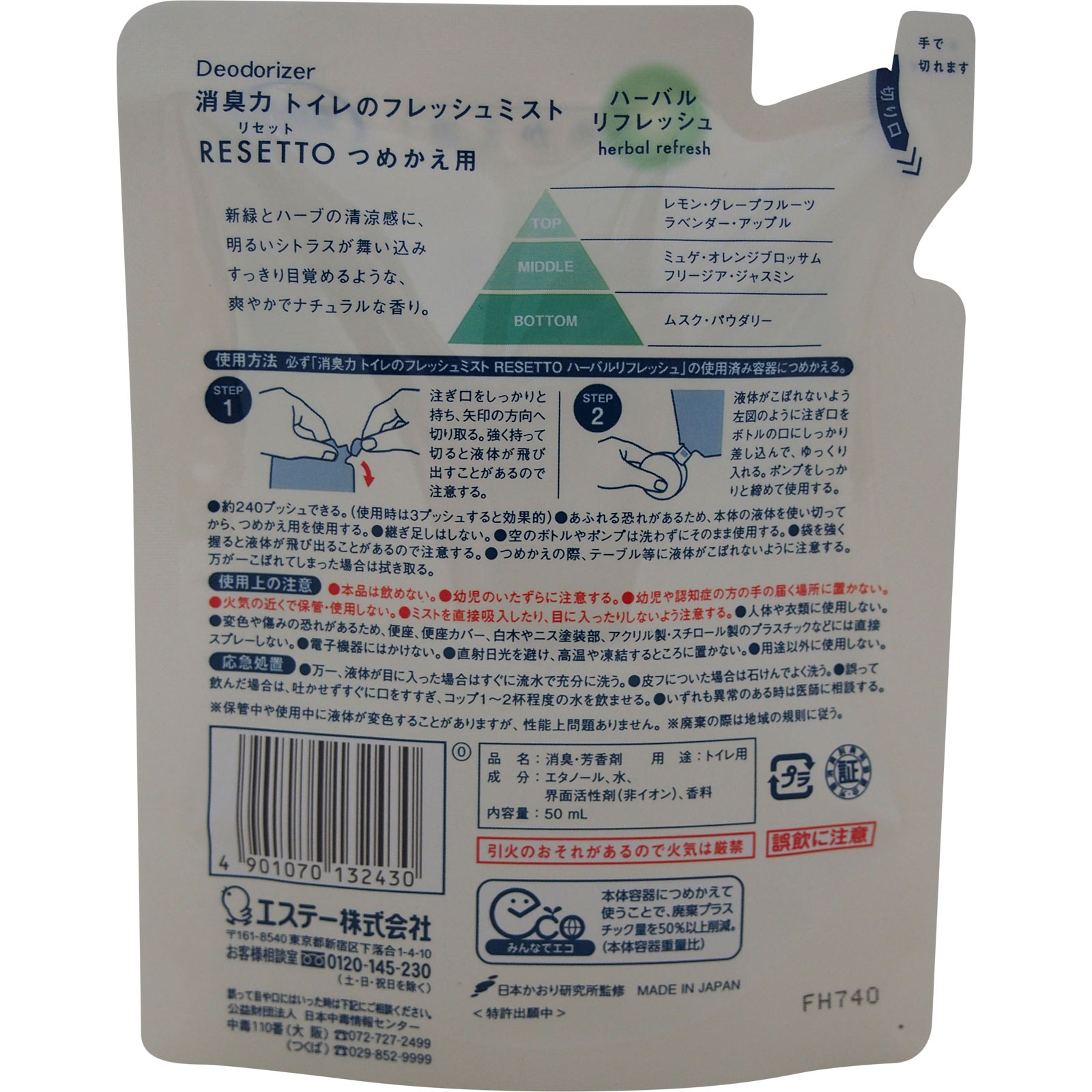 必ず「消臭力トイレのフレッシュミスト RESETTO ハーバルリフレッシュ」の使用済み容器につめかえる。
