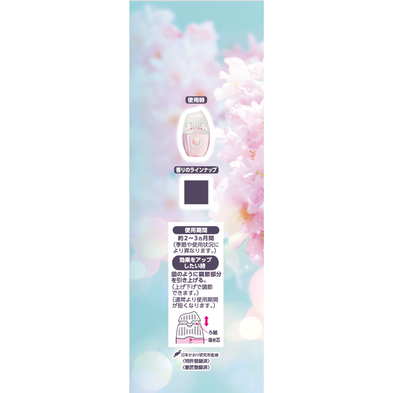 玄関・リビング限定パフューマーセレクショングローバルに活躍するパフューマーが厳選したフレグランスオイルを配合。華やかで繊細なチェリーブロッサムに明るいアップルと柔らかなムスクを重ねた香りが、風に舞う桜の花びらとともに幸せを届けます。アップルローズ、チェリーブロッサムピーチ、ムスク●移ろう季節の気持ちに寄り添う香水調の香りが空間に広がります。●ナノパウダー※が悪臭をすばやく強力に吸着し、消臭。※ナノレベルの孔(あな)を持つ、悪臭を吸着する消臭剤日本かおり研究所監修〈特許登録済〉〈意匠登録済〉