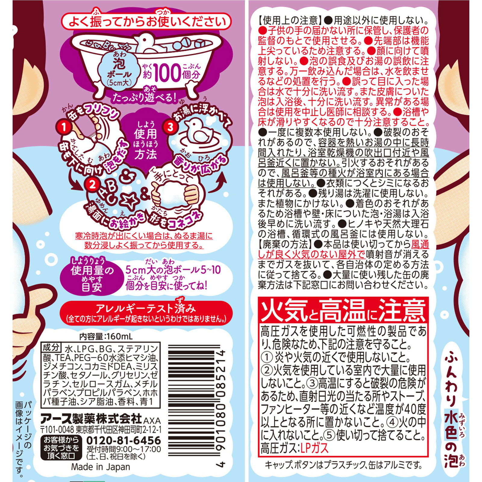 ふわふわ泡で好きな形が作れる楽しく遊べる入浴泡。湯面にお絵かきしたり、こねて形を作ったり楽しみ方は無限大です。ブドウの香り、水色のふわふわ泡です。○お湯の上にお絵かき 好きな形が作れるお湯にうかべるとだんだん溶けてふんわり広がるいい香り○泡ボール(5cm大)約100個分入っているから、たっぷり遊べる!○保湿成分シアバター&ホホバオイル配合○アレルギーテスト済み(全ての方にアレルギーが起きないというわけではありません。)