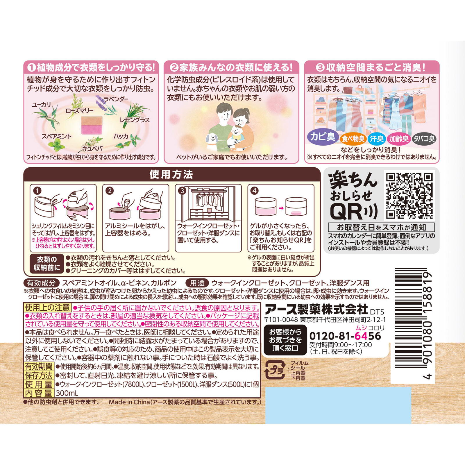 ウォークインにもせんい製品防虫剤(スペアミントオイル製剤)素敵な香り空間へ1.植物成分で衣類をしっかり守る!植物が身を守るために作り出すフィトンチッド成分で大切な衣類をしっかり防虫。ユーカリ ローズマリー ラベンダー スペアミント キュベベ ハッカ レモングラスフィトンチッドとは、植物が虫から身を守るために作り出す成分です。2.家族みんなの衣類に使える!化学防虫成分(ピレスロイド系)は使用していません。赤ちゃんの衣類やお肌の弱い方の衣類にもお使いいただけます。ペットがいるご家庭でもお使いいただけます。3.収納空間まるごと消臭!衣類はもちろん、収納空間の気になるニオイを消臭します。カビ臭 食べ物臭 汗臭 加齢臭 タバコ臭 などをしっかり消臭!※すべてのニオイを完全に消臭できるわけではありません。●他の防虫剤と併用できます。