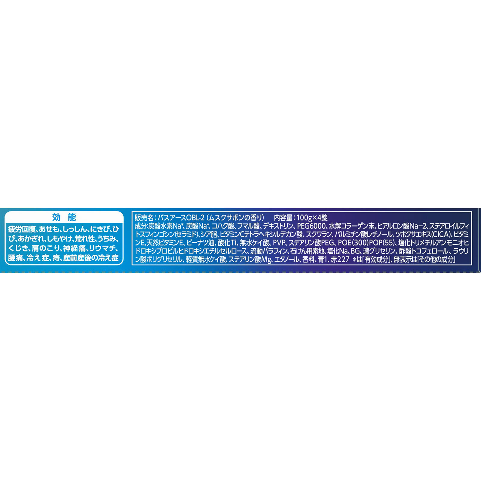 コハク酸、フマル酸、デキストリン、PEG6000、水解コラーゲン末、ヒアルロン酸Na-2、ステアロイルフィトスフィンゴシン(セラミド)、シア脂、ビタミンCテトラヘキシルデカン酸、スクワラン、パルミチン酸レチノール、ツボクサエキス(CICA)、ビタミンE、天然ビタミンE、ピーナツ油、酸化Ti、無水ケイ酸、PVP、ステアリン酸PEG、POE(300)POP(55)、塩化トリメチルアンモニオヒドロキシプロピルヒドロキシエチルセルロース、流動パラフィン、石けん用素地、塩化Na、BG、濃グリセリン、酢酸トコフェロール、ラウリン酸ポリグリセリル、軽質無水ケイ酸、ステアリン酸Mg、エタノール、香料、青1、赤227