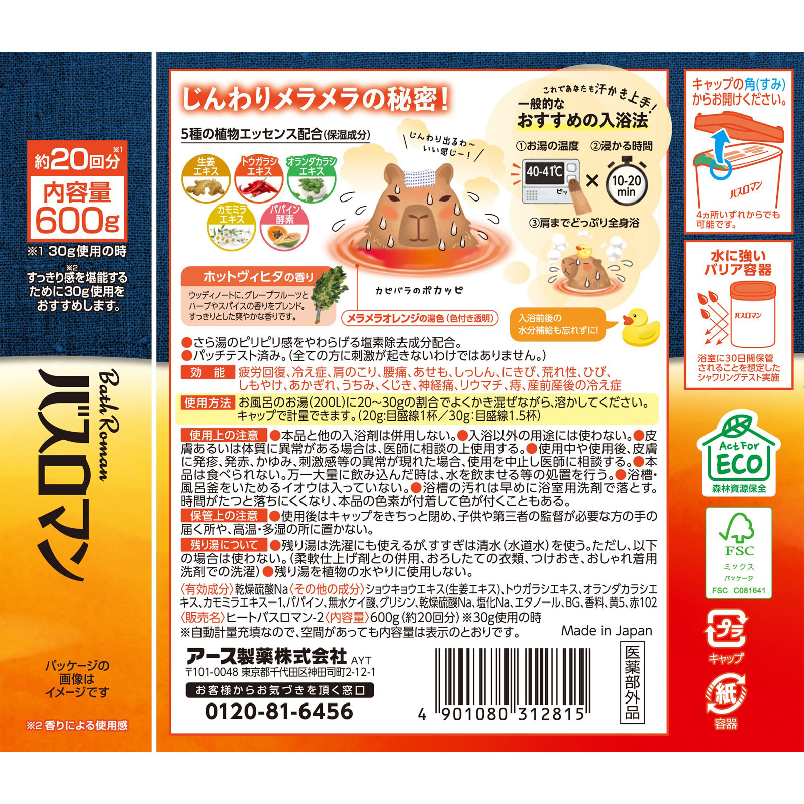 発汗促進使い続けてメラメラ燃える発汗欲汗を出す*、入浴時間。■疲労回復 ■冷え症 ■肩こり ■腰痛*温浴効果によるじんわりメラメラの秘密!○5種の植物エッセンス配合(保湿成分)生姜エキス トウガラシエキス オランダカラシエキス カモミラエキス パパイン酵素○ホットヴィヒタの香りウッディノートに、グレープフルーツとハーブやスパイスの香りをブレンド。すっきりとした爽やかな香りです。じんわり出るわ~いい感じー!メラメラオレンジの湯色(色付き透明湯)●さら湯のピリピリ感をやわらげる塩素除去成分配合。●パッチテスト済み。(全ての方に刺激が起きないわけではありません。)約20回分※1※1 30g使用の時すっきり感※2を堪能するために30g使用をおすすめします。※2 香りによる使用感・キャップの角(すみ)からお開けください。4ヵ所いずれからでも可能です。・水に強いバリア容器浴室に30日間保管されることを想定したシャワリングテスト実施