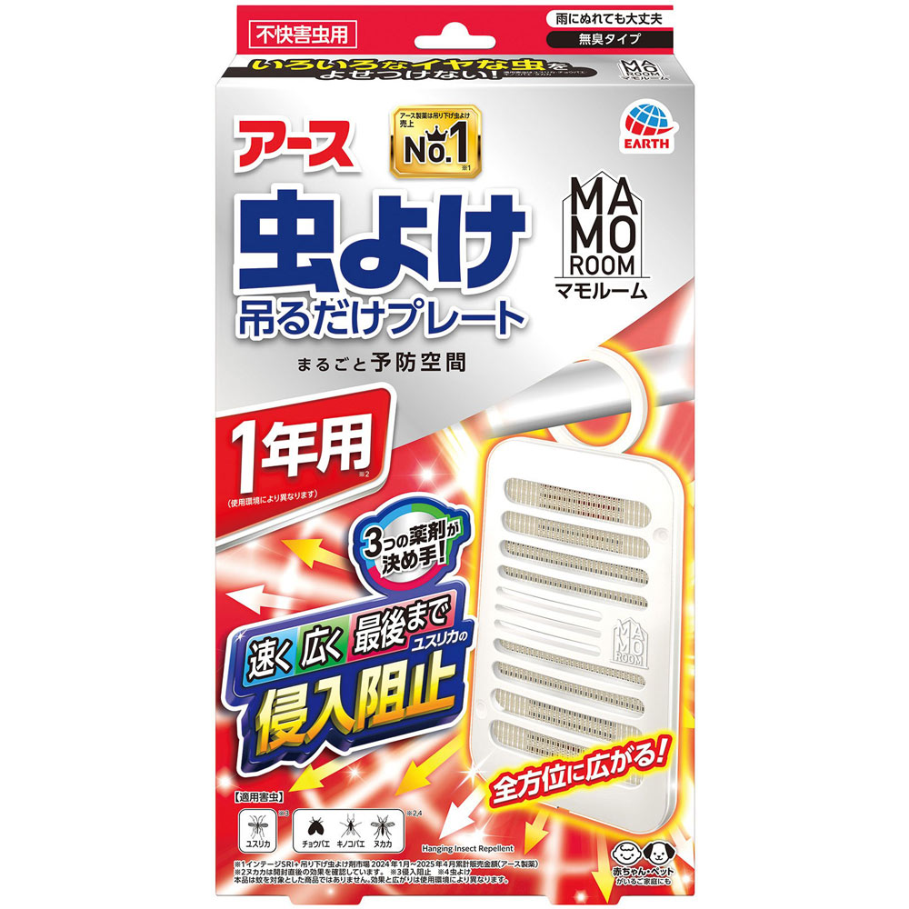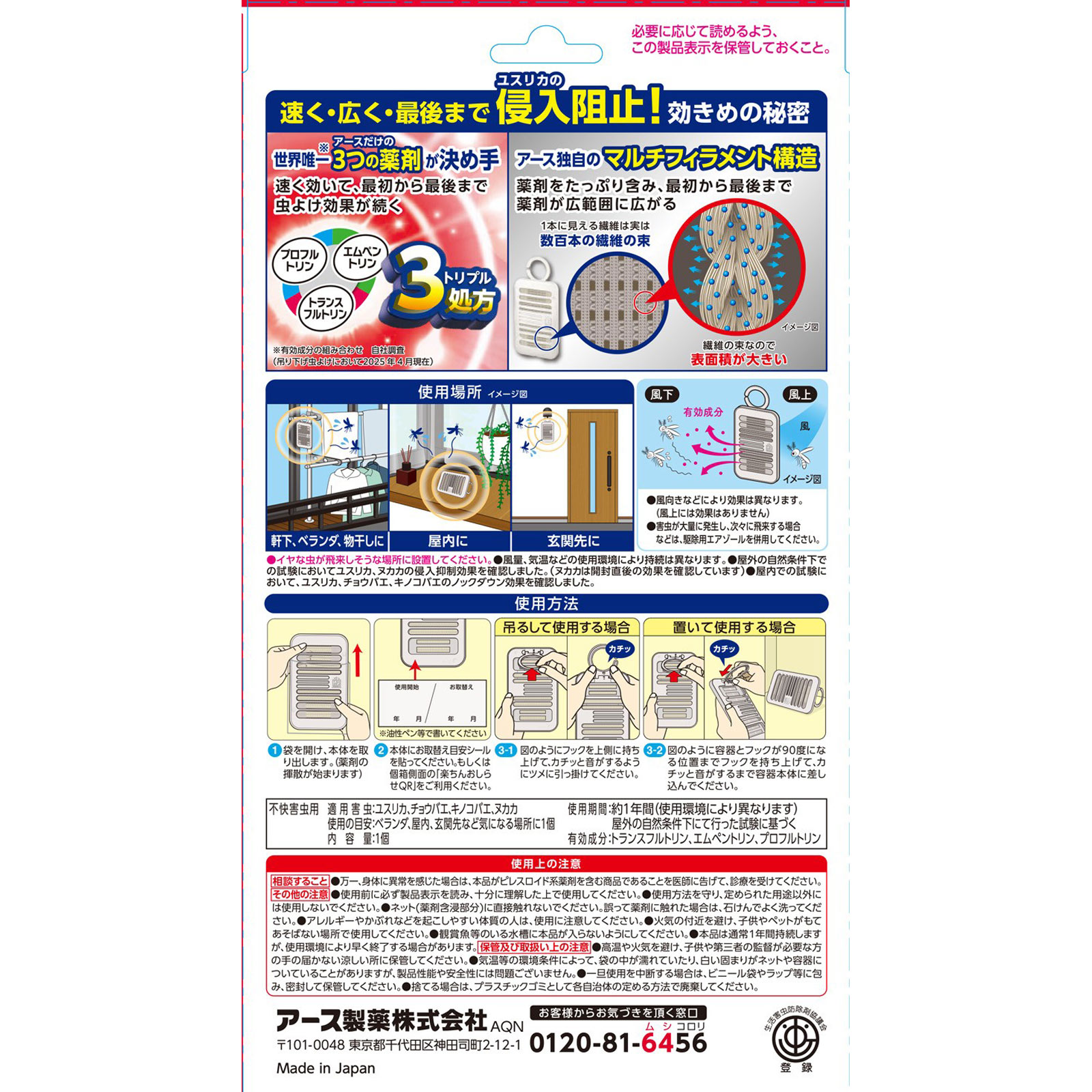 雨にぬれても大丈夫無臭タイプいろいろなイヤな虫をよせつけない!アース製薬は吊り下げ虫よけ売上No.1※1まるごと予防空間1年用※2(使用環境により異なります)全方位に広がる!【適用害虫】ユスリカ※3 チョウバエ キノコバエ ヌカカ※2,4※1 インテージSRI+吊り下げ虫よけ剤市場 2024年1月~2025年4月累計販売金額(アース製薬)※2 ヌカカは開封直後の効果を確認しています。※3 侵入阻止※4 虫よけ赤ちゃん・ペットがいるご家庭にも速く・広く・最後までユスリカの侵入阻止!効きめの秘密○世界唯一※アースだけの3つの薬剤が決め手速く効いて、最初から最後まで虫よけ効果が続くプロフルトリン エムペントリン トランスフルトリン 3トリプル処方※有効成分の組み合わせ 自社調査(吊り下げ虫よけにおいて2025年4月現在)○アース独自のマルチフィラメント構造薬剤をたっぷり含み、最初から最後まで薬剤が広範囲に広がる1本に見える繊維は実は数百本の繊維の束繊維の束なので表面積が大きい○使用場所軒下、ベランダ、物干しに 屋内に 玄関先に