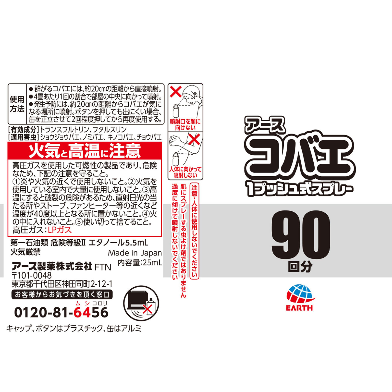 もうやられっぱなし!コバエ対策革命本気の駆除!速効 パッと落ちる!直接コバエにすみずみまで効く!部屋全体に4週間※発生予防!根本から絶つ!コバエの発生源に赤ちゃん・ペットがいるご家庭にも※閉鎖空間でのコバエの発生抑制(成虫の駆除、卵の孵化抑制を確認。使用環境により異なります。浸入抑制効果ではありません。)消臭プラスさまざまなコバエに効く!無香料●ゴミ箱や生ゴミなどに群がるコバエには、直接噴射で速効駆除します。●1プッシュするだけで薬剤が部屋に広がり、飛び回るコバエを駆除します。●コバエの発生源に噴射することで、約4週間※コバエの発生を予防します。※閉鎖空間でのコバエの発生抑制(成虫の駆除、卵の孵化抑制)を確認。使用環境により異なります。侵入抑制効果ではありません。●特殊ノズル採用!スプレー粒子がすばやく広がるので、部屋のすみずみまで薬剤が届きます。●赤ちゃん、ペットがいるご家庭にも使用できます。適用害虫:ショウジョウバエ、ノミバエ、キノコバエ、チョウバエ【効果のあるコバエ】ショウジョウバエ類 ノミバエ類:家庭の台所、生ゴミを入れるゴミ箱まわりキノコバエ類:観葉植物など植木鉢のまわり※植物には直接噴射しないでください。チョウバエ類:浴室やトイレなどの流し、排水口まわり