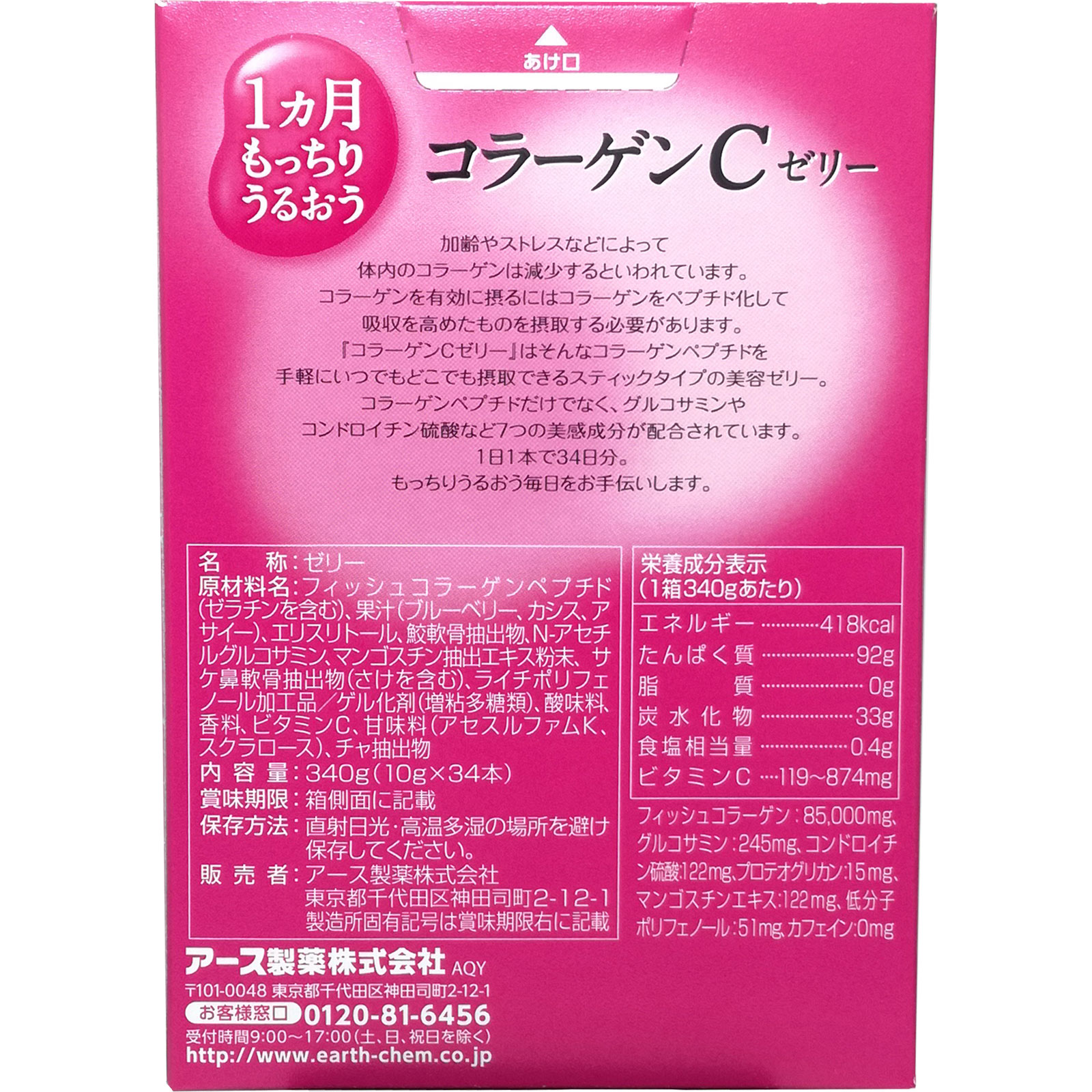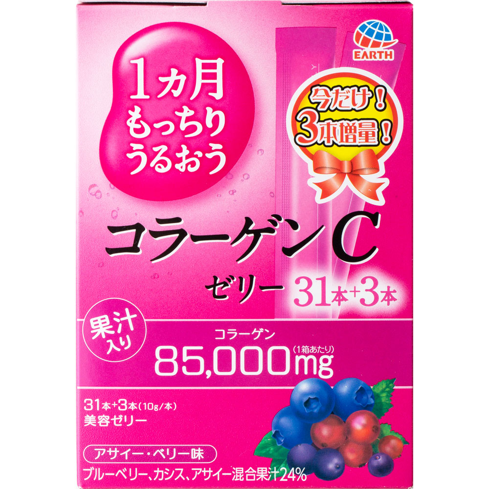 今だけ!3本増量!31本+3本(10g/本)果汁入りコラーゲン85000mg(1箱あたり)ブルーベリー、カシス、アサイー混合果汁24%加齢やストレスなどによって体内のコラーゲンは減少するといわれています。コラーゲンを有効に摂るにはコラーゲンをペプチド化して吸収を高めたものを摂取する必要があります。『コラーゲンCゼリー』はそんなコラーゲンペプチドを手軽にいつでもどこでも摂取できるスティックタイプの美容ゼリー。コラーゲンペプチドだけでなく、グルコサミンやコンドロイチン硫酸など7つの美感成分が配合されています。