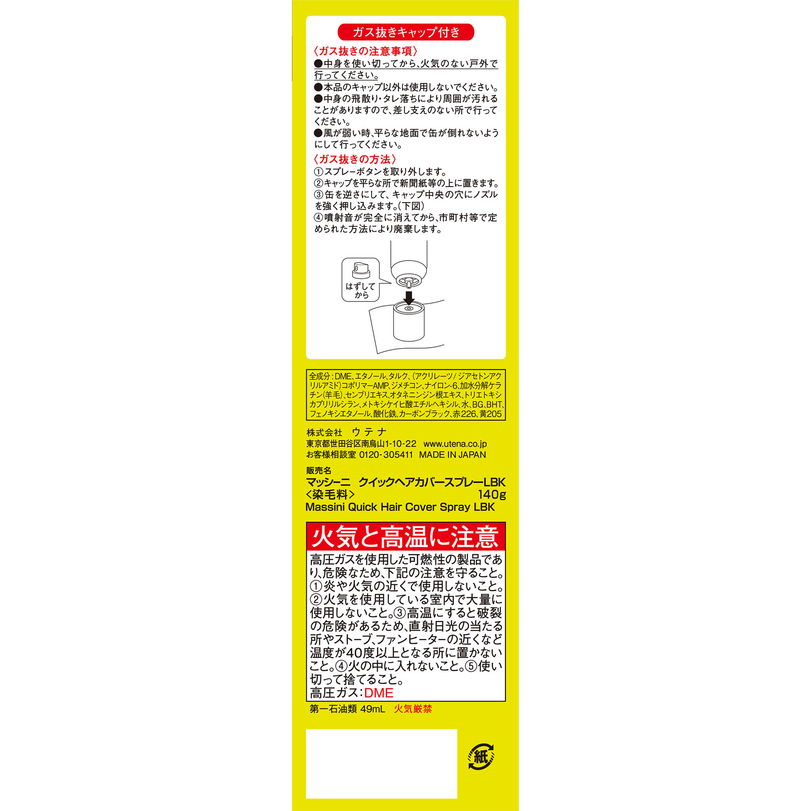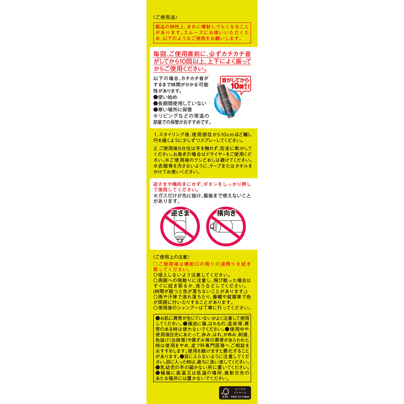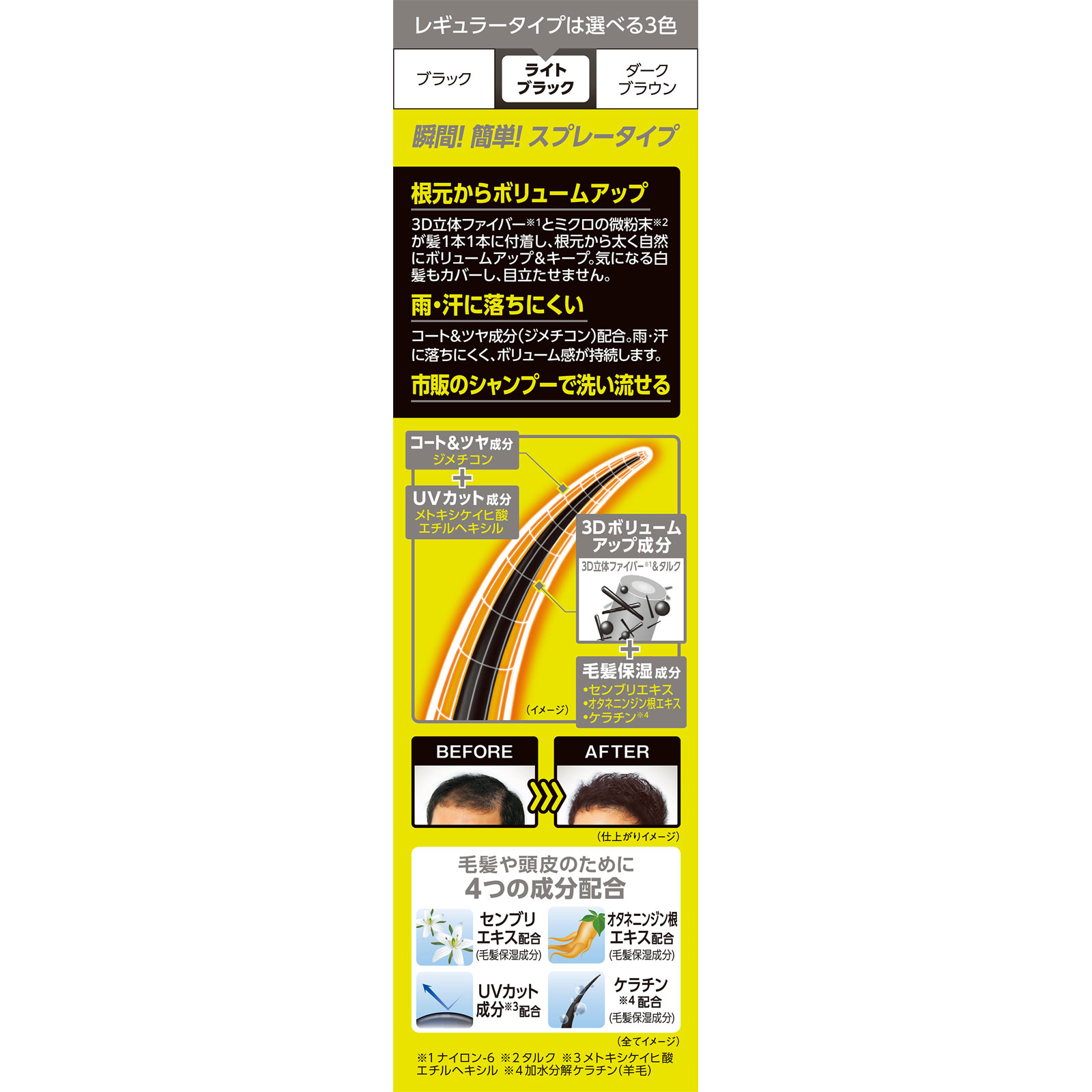 やや明るい自然な黒色髪が増えてみえる※!瞬間!透け感カバー崩れずカッチリキープセット力 レギュラー無香料※3D立体ファイバー※1&ミクロの微粉末※2が、髪1本1本に付着することで、全体として髪が太く増えてみえます。レギュラータイプは選べる3色瞬間!簡単!スプレータイプ○根元からボリュームアップ3D立体ファイバー※1とミクロの微粉末※2が髪1本1本に付着し、根元から太く自然にボリュームアップ&キープ。気になる白髪もカバーし、目立たせません。○雨・汗に落ちにくいコート&ツヤ成分(ジメチコン)配合。雨・汗に落ちにくく、ボリューム感が持続します。○市販のシャンプーで洗い流せるコート&ツヤ成分:ジメチコンUVカット成分:メトキシケイヒ酸エチルヘキシル3Dボリュームアップ成分:3D立体ファイバー※1&タルク毛髮保湿成分・センブリエキス・オタネニンジン根エキス・ケラチン※4○毛髪や頭皮のために4つの成分配合センブリエキス配合(毛髪保湿成分)オタネニンジン根エキス配合(毛髪保湿成分)UVカット成分※3配合ケラチン※4配合※1 ナイロン-6※2 タルク※3 メトキシケイヒ酸エチルヘキシル※4 加水分解ケラチン(羊毛)ガス抜きキャップ付き