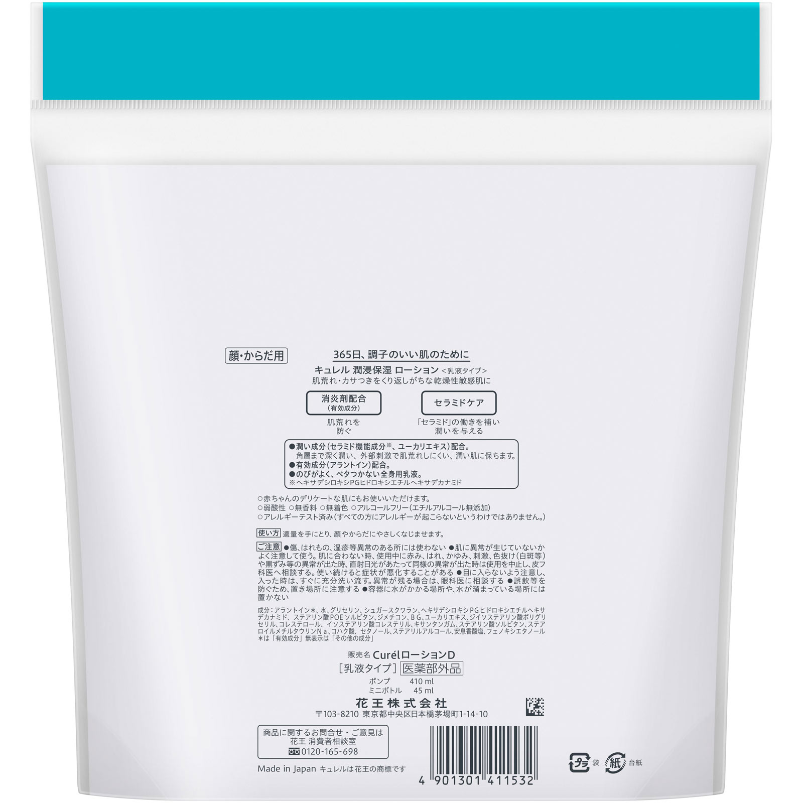 肌荒れを防ぐ全身すみずみまでセラミドケア*1*1 セラミドの働きを補い、潤いを与えるキュレルは敏感肌化粧品 売上No.1*2*2 インテージSRI+ 敏感肌用化粧品市場 2024年1月~2024年12月 シリーズ別金額シェア外出先でも!ミニボトルつき顔・からだ用365日、調子のいい肌のために肌荒れ・カサつきをくり返しがちな乾燥性敏感肌に[消炎剤配合(有効成分)]肌荒れを防ぐ[セラミドケア]「セラミド」の働きを補い潤いを与える●潤い成分(セラミド機能成分※、ユーカリエキス)配合。角層まで深く潤い、外部刺激で肌荒れしにくい、潤い肌に保ちます。●有効成分(アラントイン)配合。●のびがよく、ベタつかない全身用乳液。※ヘキサデシロキシPGヒドロキシエチルヘキサデカナミド○赤ちゃんのデリケートな肌にもお使いいただけます。○弱酸性○無香料○無着色○アルコールフリー(エチルアルコール無添加)○アレルギーテスト済み(すべての方にアレルギーが起こらないというわけではありません。)