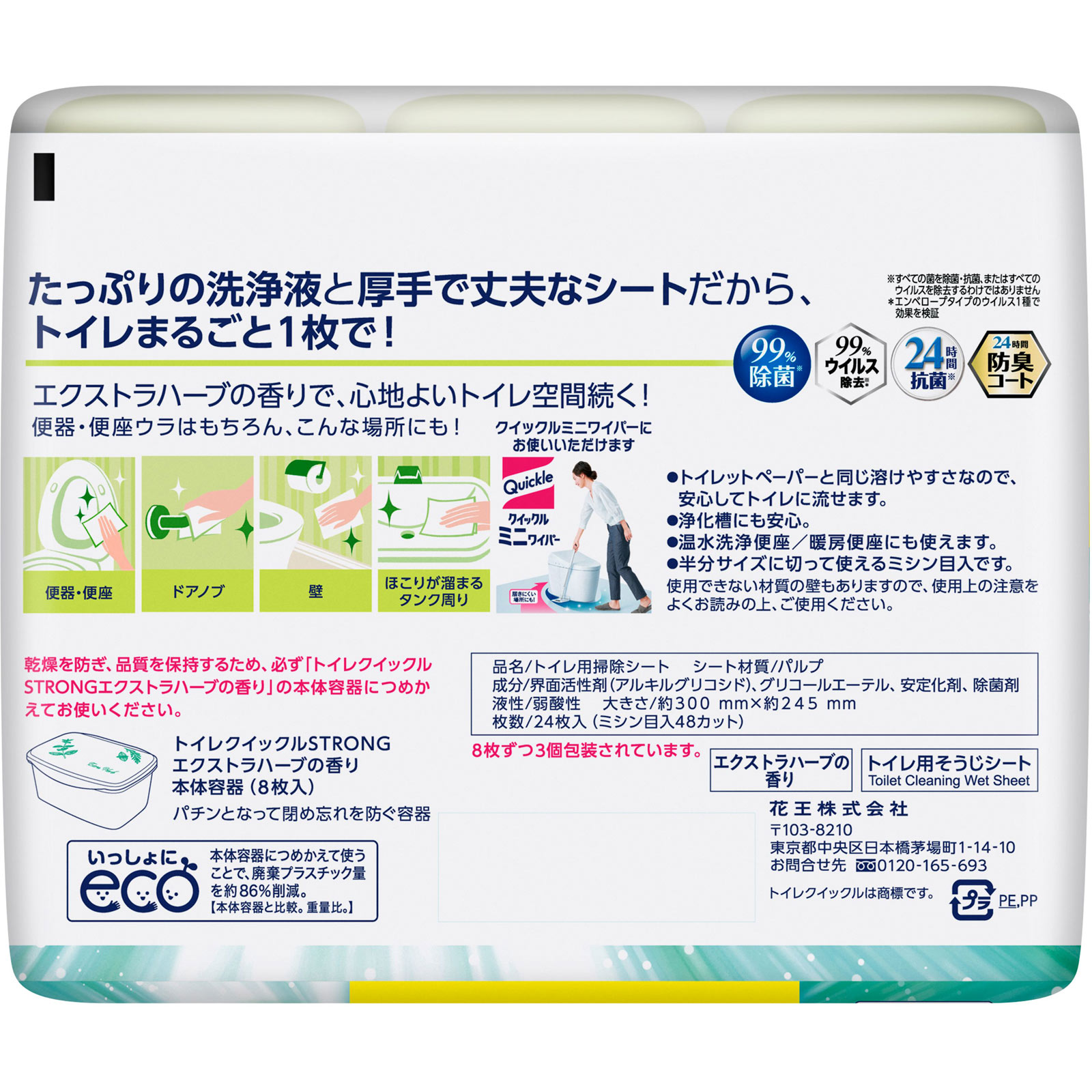 お徳用3個パック液量たっぷり!一気にラク落ち!使用後はトイレに流せます。99%除菌※ 99%ウイルス除去※* 24時間抗菌※ 24時間防臭コート※すべての菌を除菌・抗菌、またはすべてのウイルスを除去するわけではありません*エンベロープタイプのウイルス1種で効果を検証厚手で丈夫な凸凹シート便座裏のハネ汚れにもたっぷりの洗浄液と厚手で丈夫なシートだから、トイレまるごと1枚で!エクストラハーブの香りで、心地よいトイレ空間続く!○便器・便座ウラはもちろん、こんな場所にも!便器・便座 ドアノブ 壁 ほこりが溜まるタンク周り●トイレットペーパーと同じ溶けやすさなので、安心してトイレに流せます。●浄化槽にも安心。●温水洗浄便座/暖房便座にも使えます。●半分サイズに切って使えるミシン目入です。