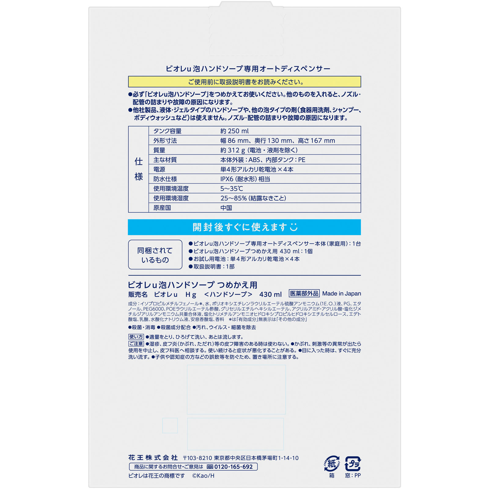 手肌にやさしいなめらか泡開封後すぐに使えます【ビオレu 泡ハンドソープ専用オートディスペンサー】まる洗いOK!防水機能[仕様]タンク容量:約250mL外形寸法:幅86mm、奥行130mm、高さ167mm質量:約312g(電池・液剤を除く)電源:単4形アルカリ乾電池×4本防水仕様:IPX6(耐水形)相当使用環境温度:5~35℃使用環境湿度:25~85%(結露なきこと)【ビオレu 泡ハンドソープ つめかえ用】●殺菌・消毒 ●殺菌成分配合 ●汚れ、ウイルス・細菌を除去