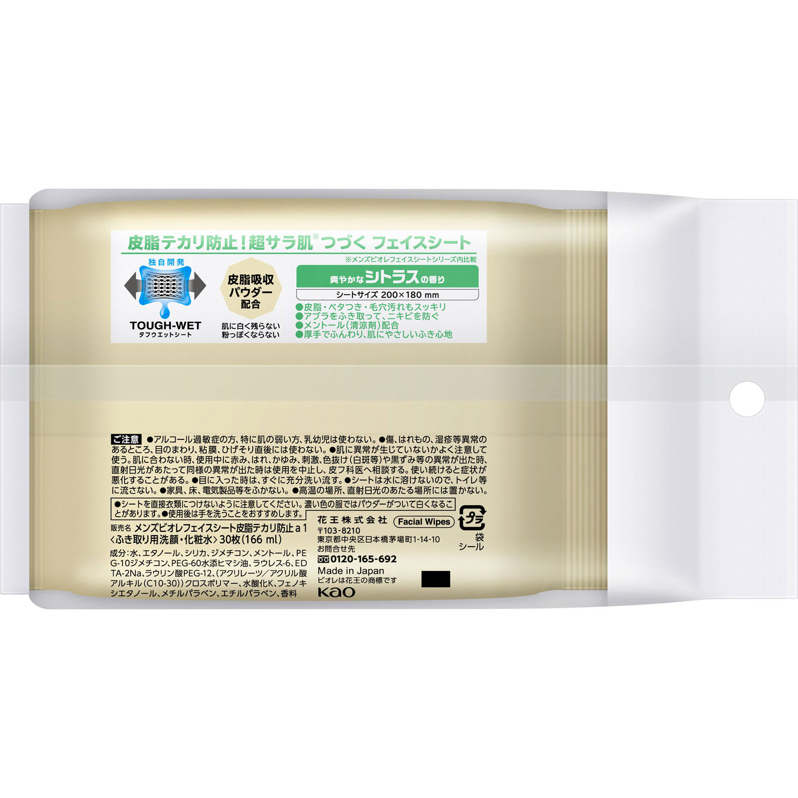 肌にこだわる男の顔用シート皮脂テカリ防止!超サラ肌※つづくフェイスシート※メンズビオレフェイスシートシリーズ内比較独自開発 タフウエットシート皮脂吸着パウダー配合:肌に白く残らない 粉っぽくならない爽やかなシトラスの香りシートサイズ 200×180mm●皮脂・ベタつき・毛穴汚れもスッキリ●アブラをふき取って、ニキビを防ぐ●メントール(清涼剤)配合●厚手でふんわり、肌にやさしいふき心地
