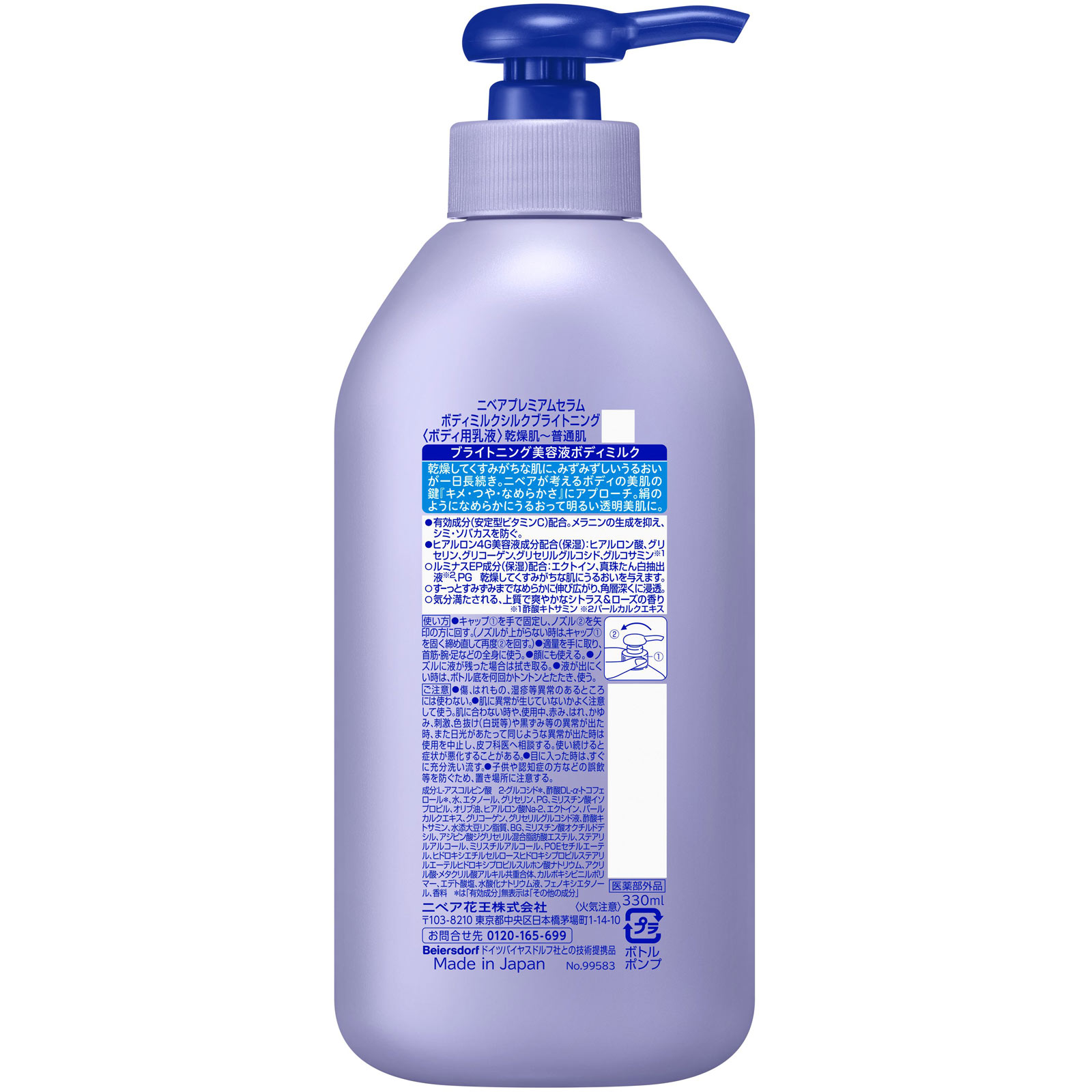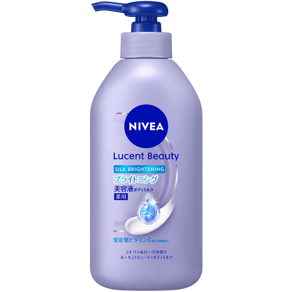薬用乾燥肌~普通肌乾燥してくすみがちな肌に、みずみずしいうるおいが一日長続き。ニベアが考えるボディの美肌の鍵『キメ・つや・なめらかさ』にアプローチ。絹のようになめらかにうるおって明るい透明美肌に。●有効成分(安定型ビタミンC)配合。メラニンの生成を抑え、シミ・ソバカスを防ぐ。●ヒアルロン4G美容液成分配合(保湿):ヒアルロン酸、グリセリン、グリコーゲン、グリセリルグルコシド、グルコサミン※1○ルミナスEP成分(保湿)配合:エクトイン、真珠たん白抽出液※2、PG 乾燥してくすみがちな肌にうるおいを与えます。○すーっとすみずみまでなめらかに伸び広がり、角層深くに浸透。○気分満たされる、上質で爽やかなシトラス&ローズの香り※1 酢酸キトサミン※2 パールカルクエキス