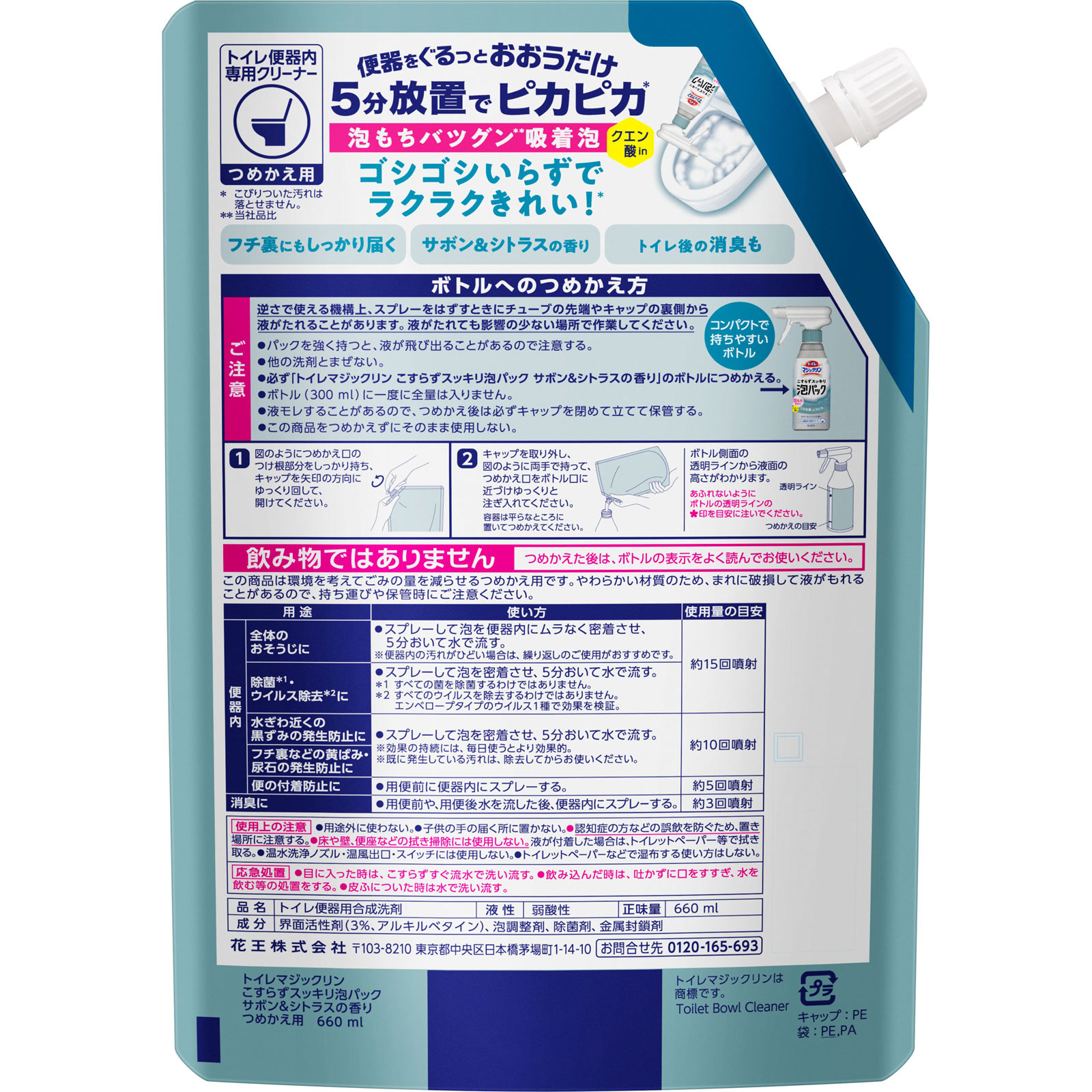 トイレマジックリン こすらずスッキリ泡パック サボン&シトラスの香り つめかえ用 660mL