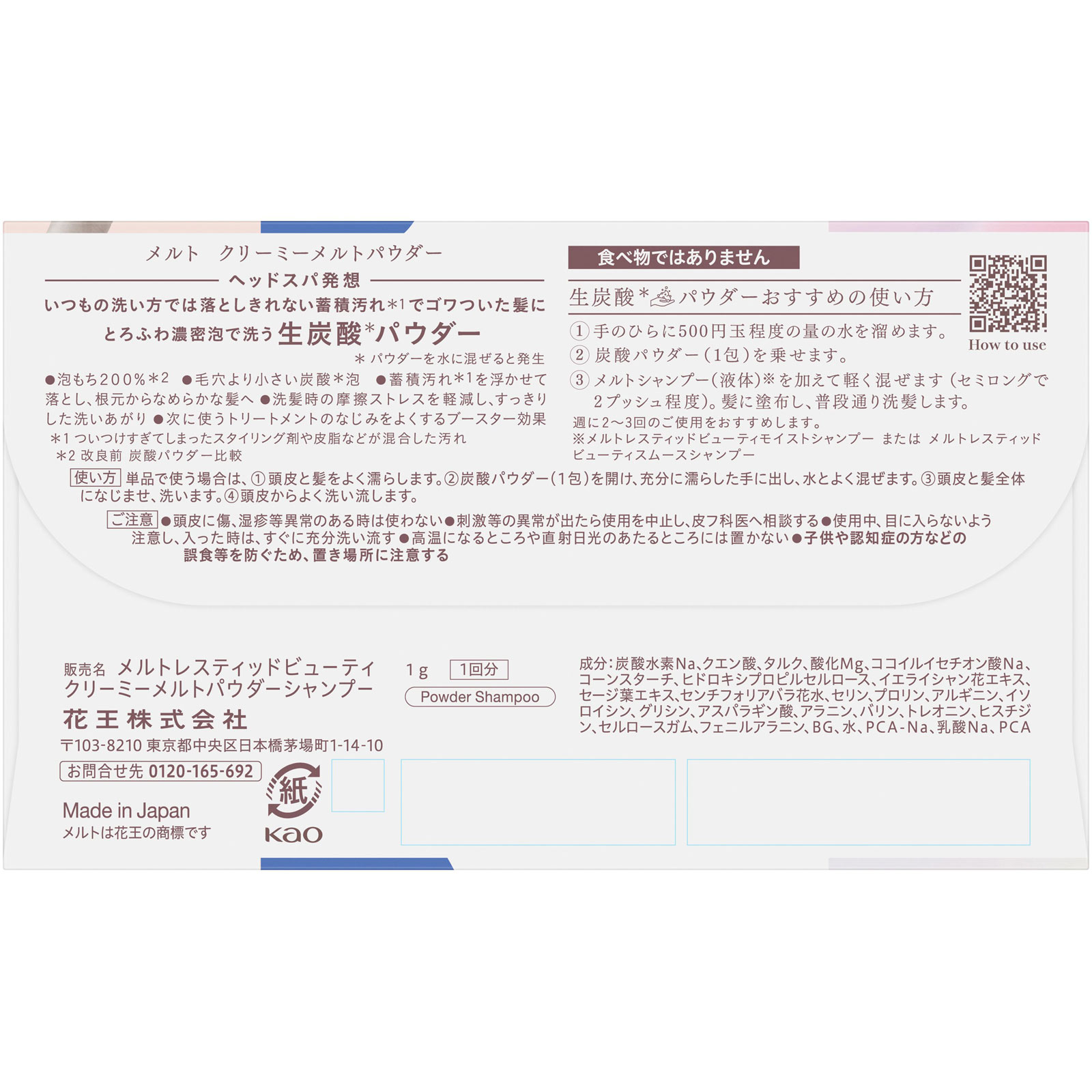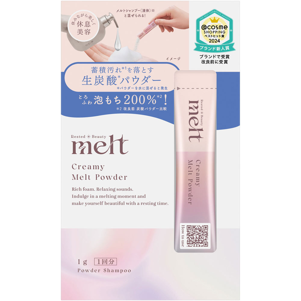 休みながら美しく 休息美容メルトシャンプー(液体)※と混ぜられる!※メルトレスティッドビューティモイストシャンプーまたはメルトレスティッドビューティスムースシャンプーヘッドスパ発想いつもの洗い方では落としきれない蓄積汚れ*1でゴワついた髪にとろふわ濃密泡で洗う生炭酸*パウダー*パウダーを水に混ぜると発生●泡もち200%*2●毛穴より小さい炭酸*泡●蓄積汚れ*1を浮かせて落とし、根元からなめらかな髪へ●洗髪時の摩擦ストレスを軽減し、すっきりした洗いあがり●次に使うトリートメントのなじみをよくするブースター効果*1 ついつけすぎてしまったスタイリング剤や皮脂などが混合した汚れ*2 改良前 炭酸パウダー皮革1回分
