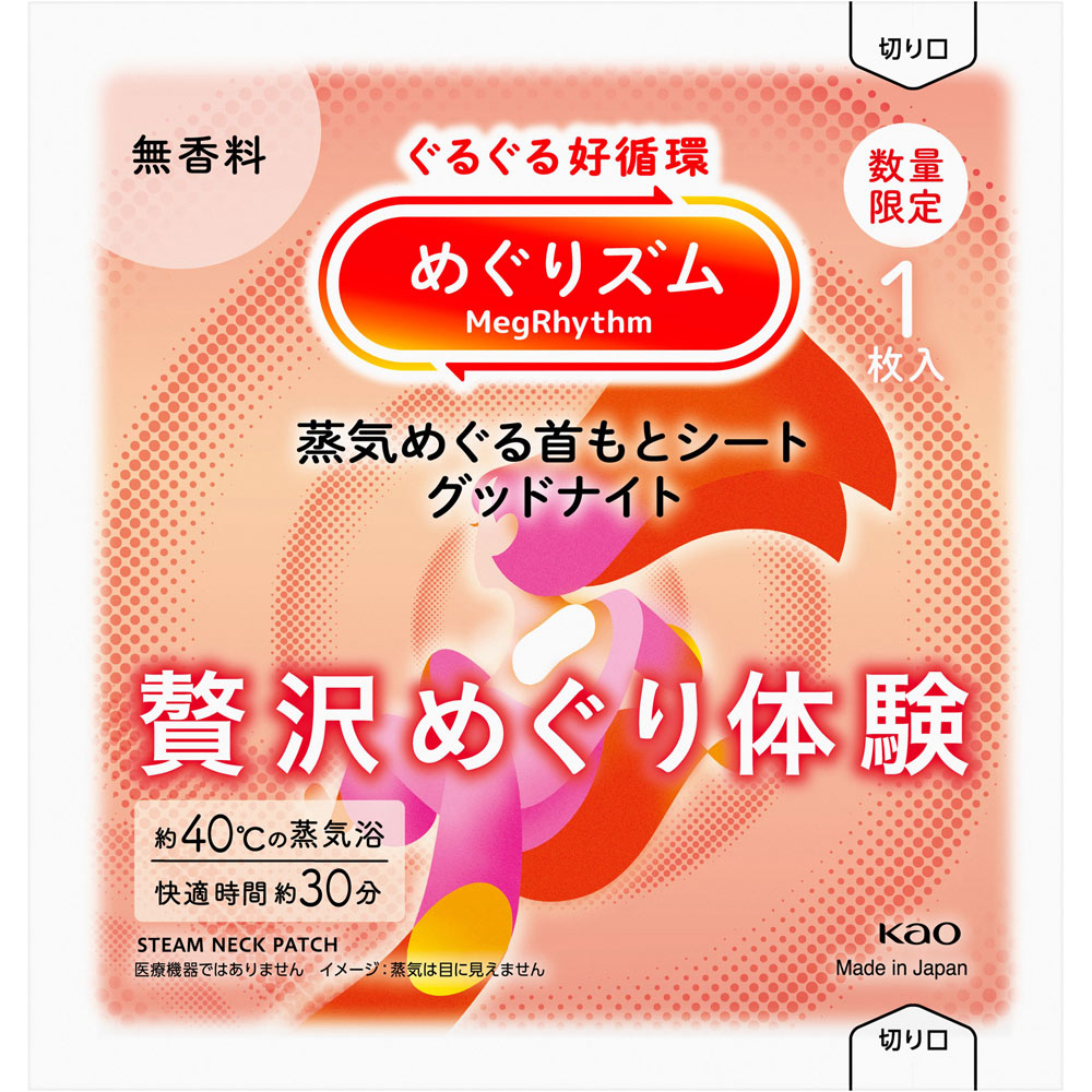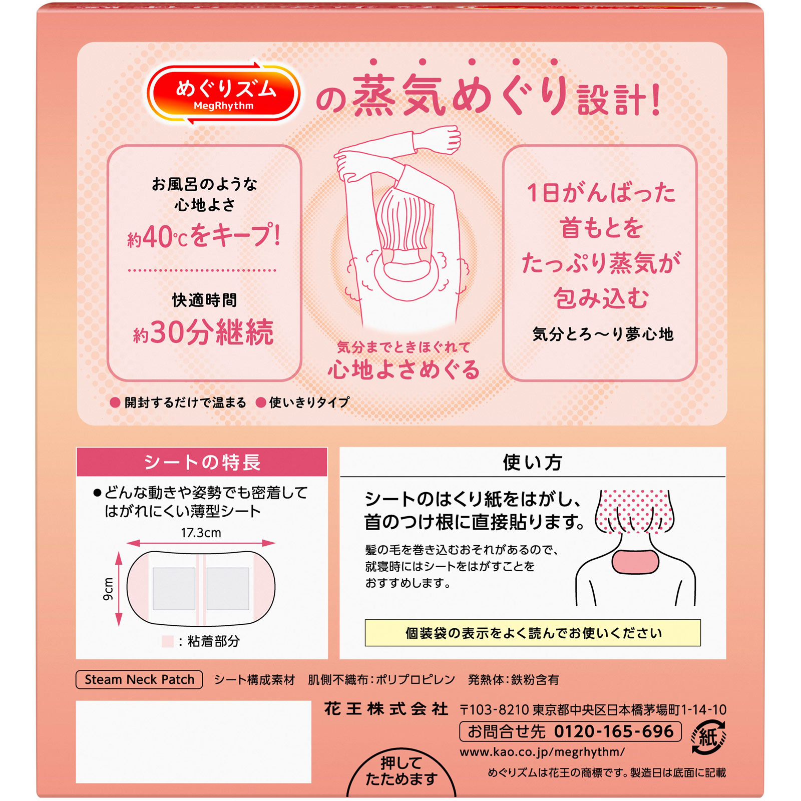 ぐるぐる好循環約40℃の蒸気浴快適時間 約30分めぐりズムの蒸気めぐり設計!気分までときほぐれて心地よさめぐるお風呂のような心地よさ 約40℃をキープ!快適時間 約30分継続1日がんばった首もとをたっぷり蒸気が包み込む 気分とろ~り夢心地●開封するだけで温まる●使いきりタイプシートの特長●どんな動きや姿勢でも密着してはがれにくい薄型シート