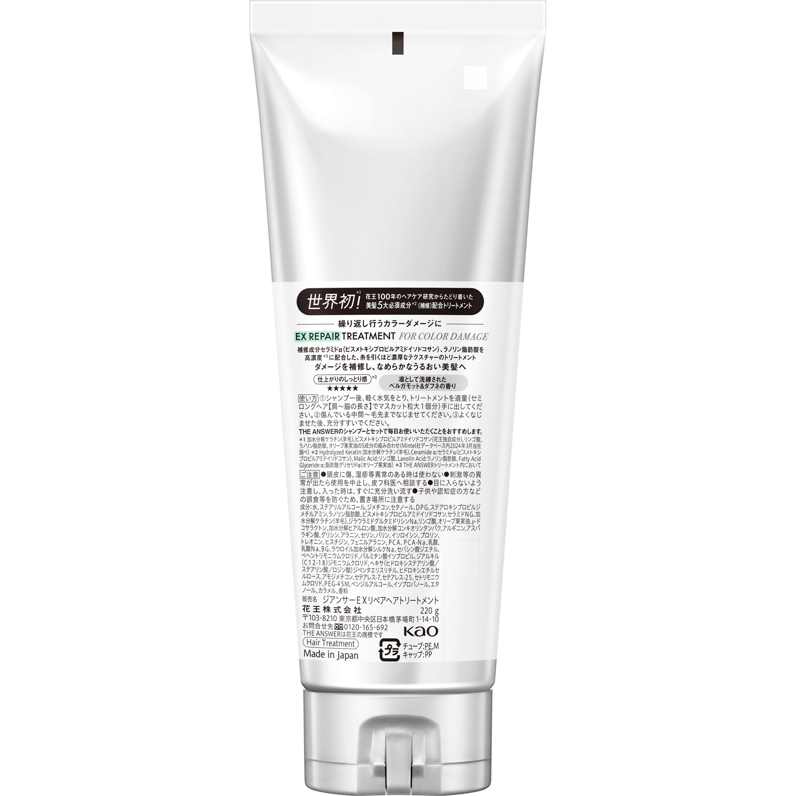 世界初*1!花王100年のヘアケア研究からたどり着いた美髪5大必須成分*2(補修)配合トリートメント繰り返し行うカラーダメージに補修成分セラミドα(ビスメトキシプロピルアミドイソドコサン)、ラノリン脂肪酸を高濃度*3に配合した、糸を引くほど濃厚なテクスチャーのトリートメントダメージを補修し、なめらかなうるおい美髪へ仕上がりのしっとり感*3 ★★★★★凛として洗練されたベルガモット&ダフネの香り*1 加水分解ケラチン(羊毛)、ビスメトキシプロピルアミドイソドコサン(花王独自成分)、リンゴ酸、ラノリン脂肪酸、オリーブ果実油の5成分の組み合わせ(Mintel社データベース内2024年3月当社調べ)*2 Hydrolyzed Keratin:加水分解ケラチン(羊毛)、Ceramide α:セラミドα(ビスメトキシプロピルアミドイソドコサン)、Malic Acid:リンゴ酸、Lanolin Acid:ラノリン脂肪酸、Fatty Acid Glyceride α:脂肪酸グリセリドα(オリーブ果実油)*3 THE ANSWERトリートメント内において