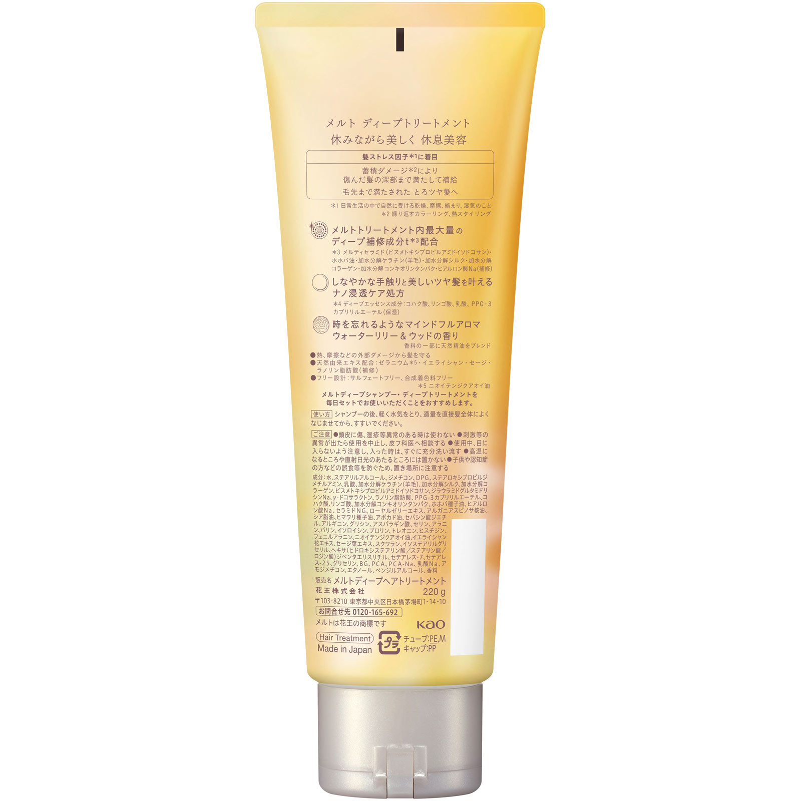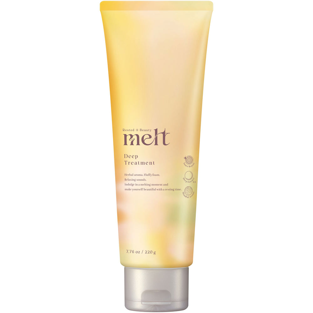 休みながら美しく 休息美容○髪ストレス因子*1に着目蓄積ダメージ*2により傷んだ髪の深部まで満たして補給 毛先まで満たされたとろツヤ髪へ*1 日常生活の中で自然に受ける乾燥、摩擦、絡まり、湿気のこと*2 繰り返すカラーリング、熱スタイリング○メルトトリートメント内最大量のディープ補修成分t*3配合*3 メルティセラミド(ビスメトキシプロピルアミドイソドコサン)・ホホバ油・加水分解ケラチン(羊毛)・加水分解シルク・加水分解コラーゲン・加水分解コンキオリンタンパク・ヒアルロン酸Na(補修)○しなやかな手触りと美しいツヤ髪を叶えるナノ浸透ケア処方*4 ディープエッセンス成分:コハク酸、リンゴ酸、乳酸、PPG-3カプリリルエーテル(保湿)○時を忘れるようなマインドフルアロマ ウォーターリリー&ウッドの香り香料の一部に天然精油をブレンド●熱、摩擦などの外部ダメージから髪を守る●天然由来エキス配合:ゼラニウム*5・イエライシャン・セージ・ラノリン脂肪酸(補修)●フリー設計:サルフェートフリー、合成着色料フリー*5 ニオイテンジクアオイ油メルトディープシャンプー・ディープトリートメントを毎日セットでお使いいただくことをおすすめします。