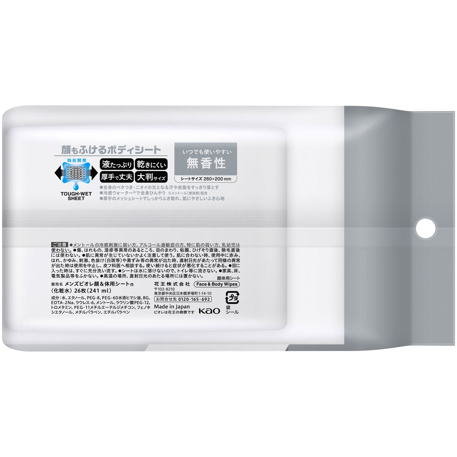 顔体用シート独自開発TOUGH-WET SHEET液たっぷり 乾きにくい 厚手で丈夫 大判サイズいつでも使いやすいシートサイズ260×200mm●全身のベタつき・ニオイの元となる汗や皮脂をすっきり落とす●冷感ウォーター※で全身ひんやり※メントール(清涼剤)配合●厚手のメッシュシートでしっかりふき取れ、肌にやさしいふき心地